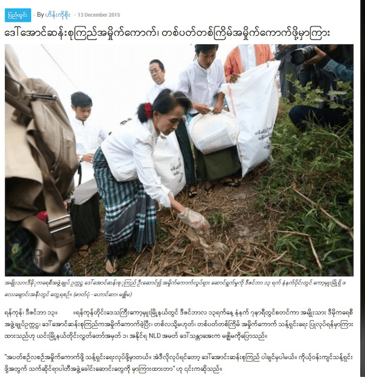 ဥပမာ ။ ၂၀၁၅ ရွေးကောက်ပွဲပြီးတော့ ဒေါ်အောင်ဆန်းစုကြည် ကိုယ်တိုင် ကော့မှူးမြို့ကို သွားပြီး အမှိုက်ကောက်ပြခဲ့တယ်။ ( ပုံ ၁ )