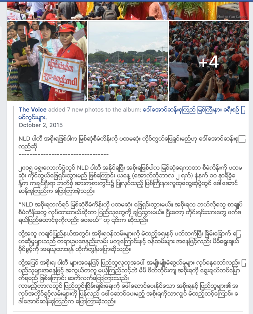 အင်န်အယ်လ်ဒီအစိုးရ တက်ရင် မြစ်ဆုံစီမံကိန်းကို ပထမဆုံးဖြေရှင်းမယ်။ xx ပြည်သူတွေကို ချပြ သွားမယ်။ တိုင်းရင်းသားတွေ ဖက်ဒရယ်ပြည်ထောင်စုလည်းပေးမယ်။ ( ၂၀၁၅ ပုံ ၂)