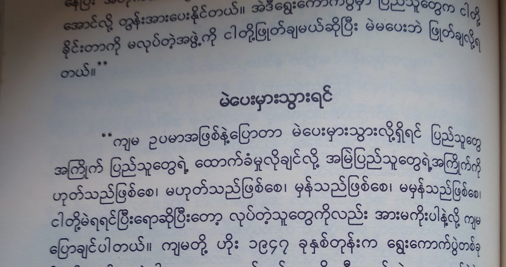 ပြည်သူတွေဆီက မဲလိုချင်တုန်းကတော့ မဲပေးပါလို့တောင်းခံပြီးတော့ မဲဆွယ်ပြီးတော့ အမျိုးမျိုး စည်းရုံးခဲ့ပြီးတော့ အစိုးရဖြစ်လာပြီးတော့ ပြည်သူတွေရဲ့ ဆန္ဒကို လျစ်လျူရှုတယ်ဆိုတာ အစိုးရ ကောင်းများရဲ့ လုပ်သင့်လုပ်ထိုက်တဲ့အလုပ်မဟုတ်ဘူး။ ( ၂၀၁၇ ပုံ ၅)