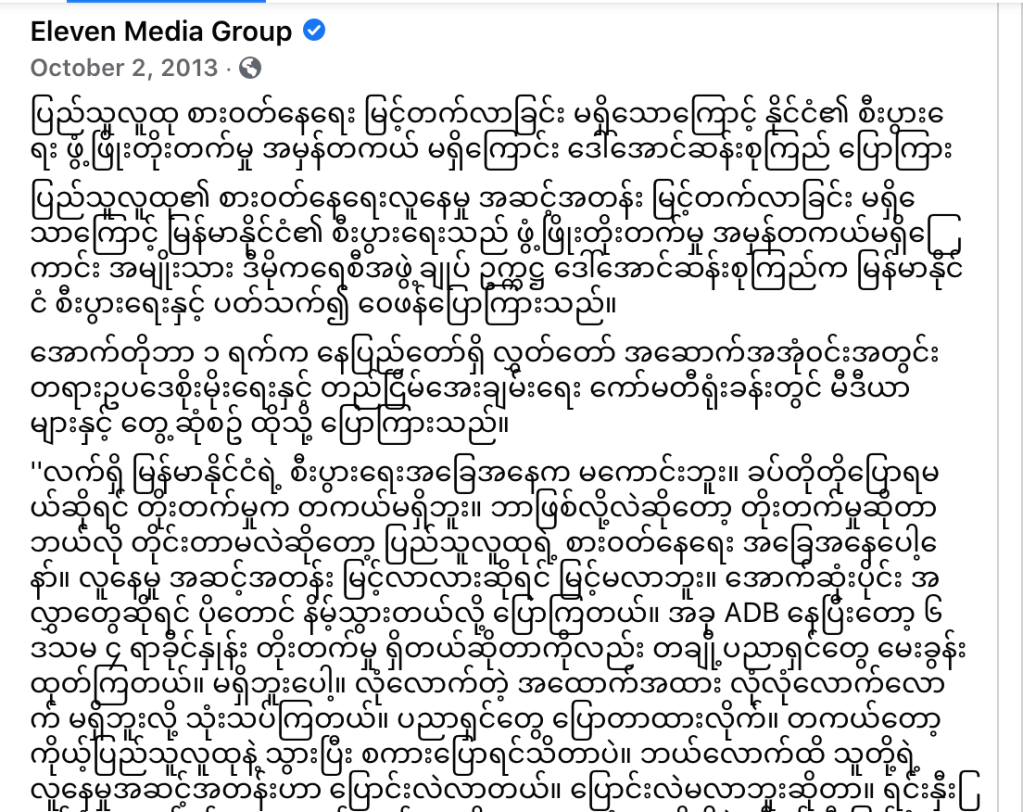 “ အခု ADB ကနေပြီးတော့ ၆.၄% ရှိတယ်ဆိုတာလည်း တစ်ချို့ပညာရှင်တွေက မေးခွန်းထုတ် ကြတယ်။ xx ပညာရှင်တွေပြောတာထားလိုက်၊ တကယ်တော့ ကိုယ့်ပြည်သူလူထုနဲ့ သွားပြီး စကားပြောရင် သိတာပဲ။ ဘယ်လောက်အထိ သူတို့ရဲ့ လူနေမှုအဆင့်အတန်း ပြောင်းလဲ လာတယ်။ ပြောင်းလဲမလာဘူးဆိုတာ။”