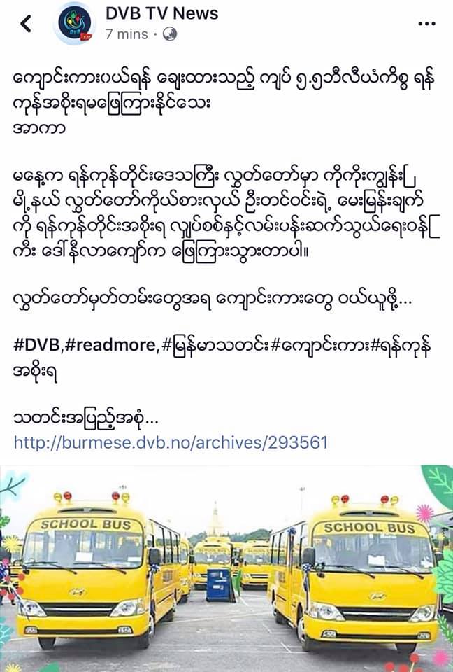 ၉ ။ ကျောင်းကားဝယ်ရန်ချေးထားသည့် ကျပ် ၅.၅ ဘီလီယံကိစ္စ ရန်ကုန်အစိုးရ မဖြေကြားနိုင် သေး။