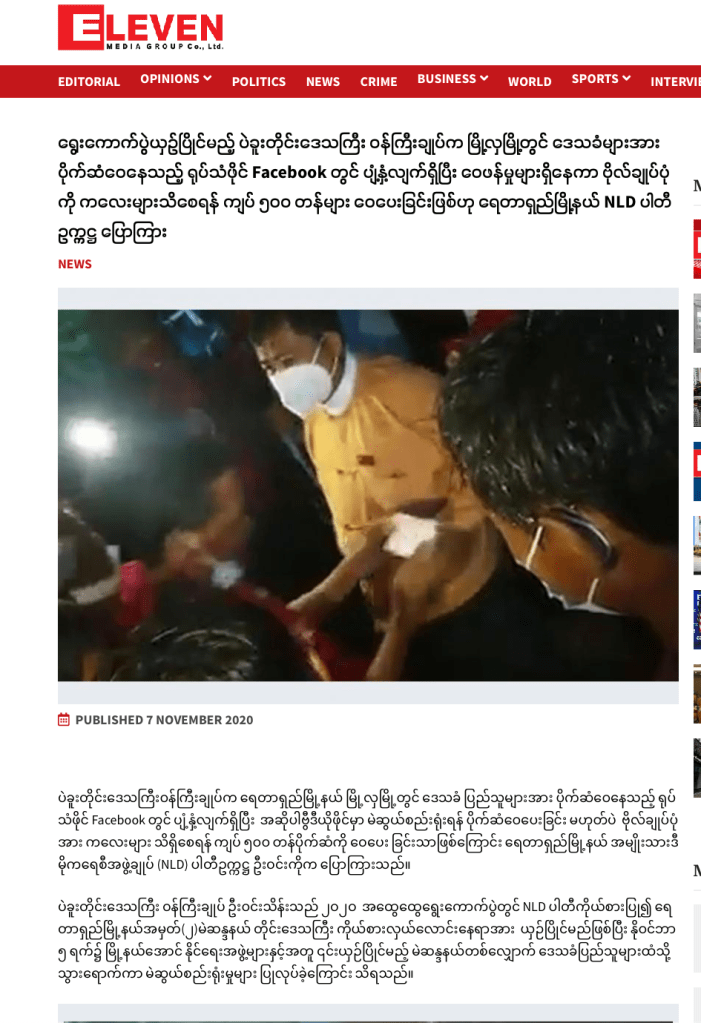 အခု ရေတာရှည်မြို့နယ် မြို့လှမြို့မှာ မဲဆွယ်စည်းရုံးရေးဆင်းရင်းနဲ့ ဒေသခံတွေကို ပိုက်ဆံတွေ ဝေနေတဲ့ ဗီဒီယိုဖိုင်တက်လာတယ်။ ဒါပေမယ့် အဲဒါ ပိုက်ဆံဝေတာမဟုတ်ဘူးတဲ့၊ ကလေး တွေ ဗိုလ်ချုပ်ပုံမြင်ဖူးအောင် ၅၀၀ တန်တွေဝေပေးတာဆိုပဲ ( ပုံ ၁)