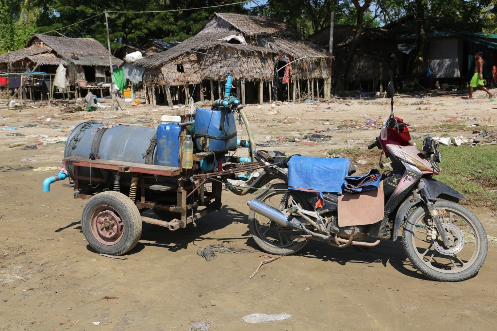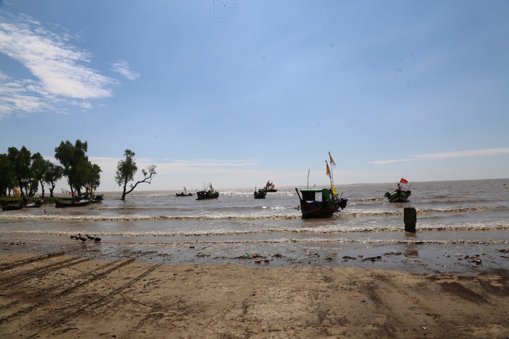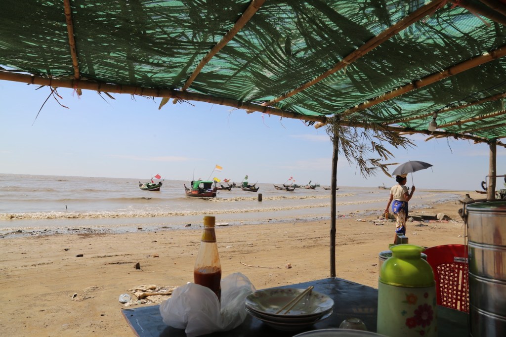 ကမ်းစပ်မှာ မုန့်နဲ့ ကော်ဖီမစ်ရောင်းတဲ့ ဆိုင်တစ်ဆိုင်ပဲရှိတယ်။ ကိုဗစ် မကိုက်ခင်ကတော့ သင်္ကြန် နဲ့ ရုံးပိတ်ရက်တွေဆိုရင် ဈေးဆိုင်တွေအများကြီးပဲ။ တစ်နေ့ လေးငါးသိန်းဖိုးရောင်းရသတဲ့ ။ အခု တော့ ကမ်းခြေမှာ ကျွန်တော်တို့ ကားတစ်စီး နဲ့ ဒေသခံလို့ထင်ရသူ လေးငါးယောက်ရဲ့ ဆိုင် ကယ် သုံးလေးစီးပဲရှိတယ်။ ပင်လယ်ကမ်းစပ်မှာ ဘဲတစ်အုပ်ရှိတယ်။ ရေဆင်းဆော့နေတဲ့ ခွေး တစ်ကောင်ရှိတယ်။ ငါးဖမ်းလှေတွေအတွက် ရေချိုပေးဖို့ ဆိုင်ကယ်နဲ့တွဲထားတဲ့ ရေစည် လှည်းတစ်စီးရှိတယ်။
