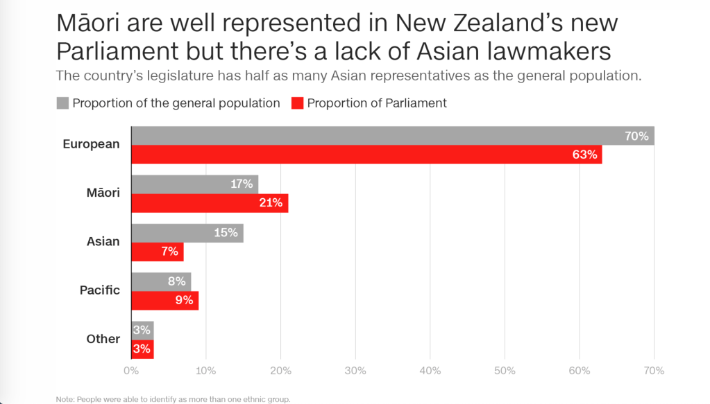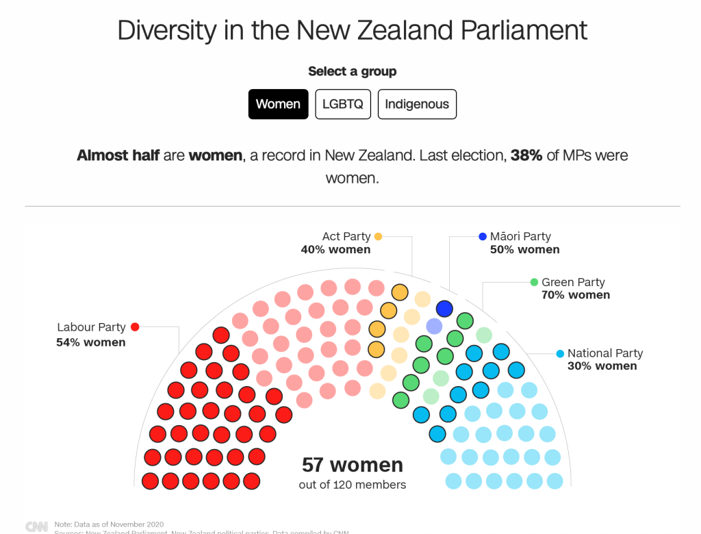 ၂၀၂၀ အောက်တိုဘာလ မှာကျင်းပခဲ့တဲ့ နယူးဇီလန်နိုင်ငံရွေးကောက်ပွဲကနေပေါ်ထွက်လာတဲ့ လွှတ်တော်ကတော့ ကမ္ဘာပေါ်မှာ ကိုယ်စားပြုမှုအစုံလင်ဆုံး လွှတ်တော်တစ်ခုဖြစ်တယ်လို့ နိုဝင်ဘာ ၁၇ ရက်နေ့ CNN သတင်းမှာဖော်ပြထားတာကိုတွေ့ရပါတယ်။