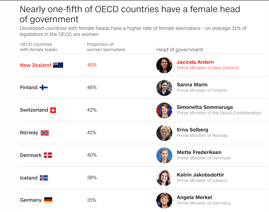ဒါ့အပြင်နယူးဇီလန်ဟာ ဒီမိုကရေစီစနစ်ခိုင်မာနေပြီဖြစ်တဲ့ Organisation for Economic Co-operation and Development (OECD) နိုင်ငံတွေထဲမှာလည်း အမျိုးသမီး လွှတ်တော် ကိုယ်စားလှယ်ပါဝင်မှုအချိုးအစား အမြင့်ဆုံးနိုင်ငံလည်းဖြစ်ပါတယ်။ထူးခြားတာက OECD နိုင်ငံတွေရဲ့ လွှတ်တော်များမှာ အမျိုးသမီးပါဝင်မှုက ပ ျှမ်းမ ျှ ၃၁ % ဖြစ်ပြီး အမျိုးသမီး ပါဝင်မှု ၃၁% နဲ့အထက်ရှိတဲ့နိုင်ငံတွေရဲ့ ခေါင်းဆောင်တွေကအမျိုးသမီးတွေဖြစ်နေတာပါပဲ ။ ( ပုံ ၃)