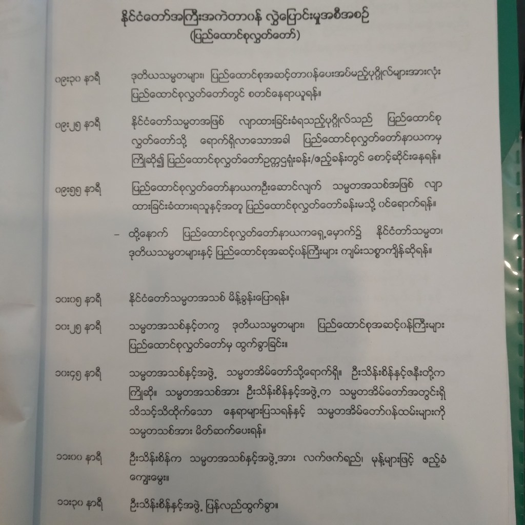 အဲဒီအခြေအနေကို ကျွန်တော်တို့ ဘက်မှာ ပြန်လည်တင်ပြဆွေးနွေးပြီးတဲ့အခါ ကျွန်တော်တို့ ဘက်က ဂုဏ်ပြုတပ်ဖွဲ့နဲ့အလေးပြုတဲ့အစီအစဉ်၊ အခမ်းအနားအပြီးလက်ဖက်ရည်ပွဲနဲ့ ဧည့်ခံ တဲ့ အစီအစဉ်၊ သမ္မတသစ်ကို အိမ်တော်အတွင်းလိုက်လံရှင်းပြမယ့်အစီအစဉ်တွေကိုဖျက်လိုက် လိုက်ပြီး အဆိုပြုချက် အသစ်ကို ပြန်တင်ပြလိုက်တယ်။ ( ပုံ ၂)