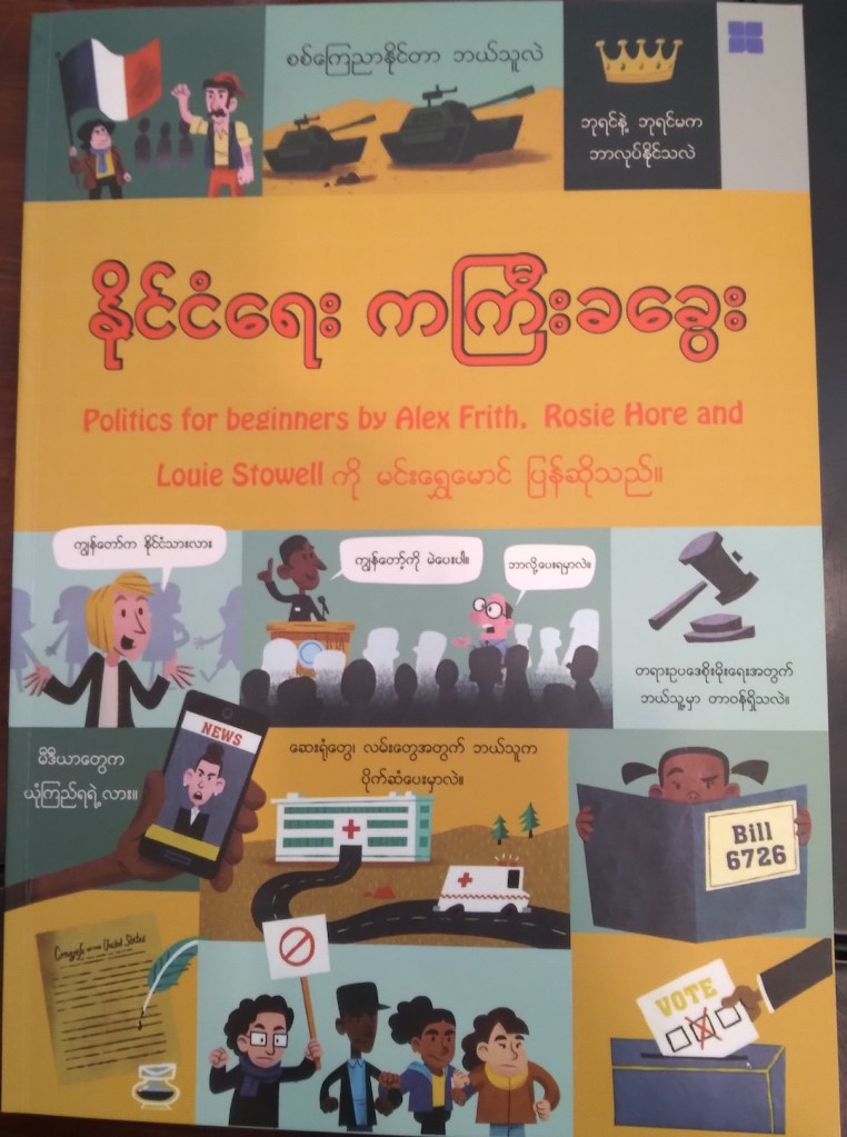 “ နိုင်ငံရေး ကကြီး ခခွေး” ( မင်းရွှေမောင် ၊ Myanmar Heritage စာအုပ်တိုက်၊ စက်တင်ဘာ ၂၀၂၀ ) ဆိုတဲ့ စာအုပ်ကိုတွေ့တယ်။ ဒီစာအုပ်က ဘာသာပြန်စာအုပ်ဖြစ်ပြီး မူရင်းစာအုပ်က “Politics for Beginners” ဆိုတဲ့စာအုပ်ဖြစ် ပါတယ်။