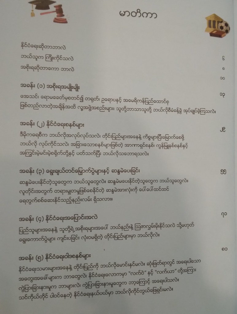 စာမျက်နှာ ၁၂၈ မျက်နှာရှိတဲ့ ဒီစာအုပ်မှာ အစိုးရအမျိုးမျိုး၊ နိုင်ငံရေးစနစ်များ၊ ရွေးချယ်တင်မြှောက် ပွဲများနှင့် ဆန္ဒမဲပေးခြင်း၊ နိုင်ငံရေးအပြောင်းအလဲ၊ နိုင်ငံရေးဝါဒစနစ်များ၊ အရေးပါသော မေးခွန်း များဆိုတဲ့ အခန်းခြောက်ခန်းပါပြီး ရုပ်ပုံများနဲ့ လိုတိုရှင်း ရေးသားထားတယ်။