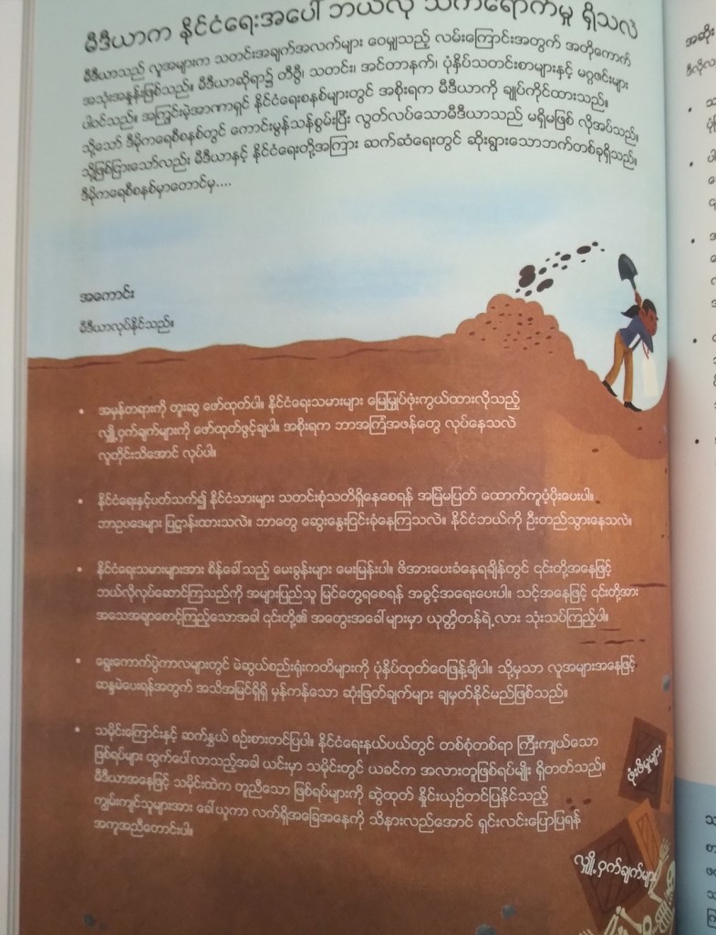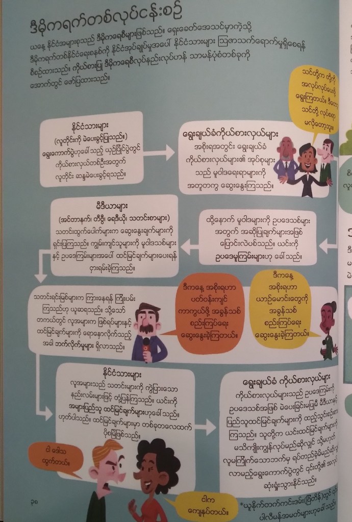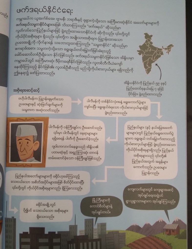 ရုပ်သံသတင်း၊ သတင်းစာ နဲ့ ဂျာနယ်တွေမှာပါတဲ့ နိုင်ငံရေးသတင်းတွေကို တွေ့တိုင်း နိုင်ငံရေး ဝေါဟာရတွေအကြောင်းမေးလေ့ရှိတဲ့ ၈ တန်းကလေးတစ်ယောက်အတွက် နိုင်ငံရေးအဘိဓာန် စာအုပ်လိုက်ရှာတဲ့အခါ