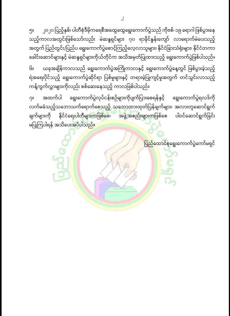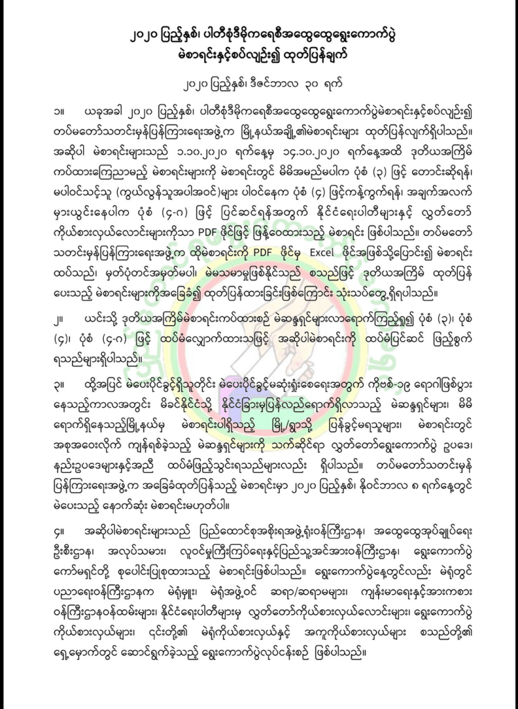 ပြည်ထောင်စုရွေးကောက်ပွဲကော်မရှင်က ဒီနေ့ ( ဒီဇင်ဘာ ၃၀ ) ရက်နေ့ ရက်စွဲနဲ့ ကြေညာချက် တစ်စောင်ထုတ်ပြန်ခဲ့တယ်။ ဒီထုတ်ပြန်ချက်ရဲ့ အဓိက အချက်ကတော့