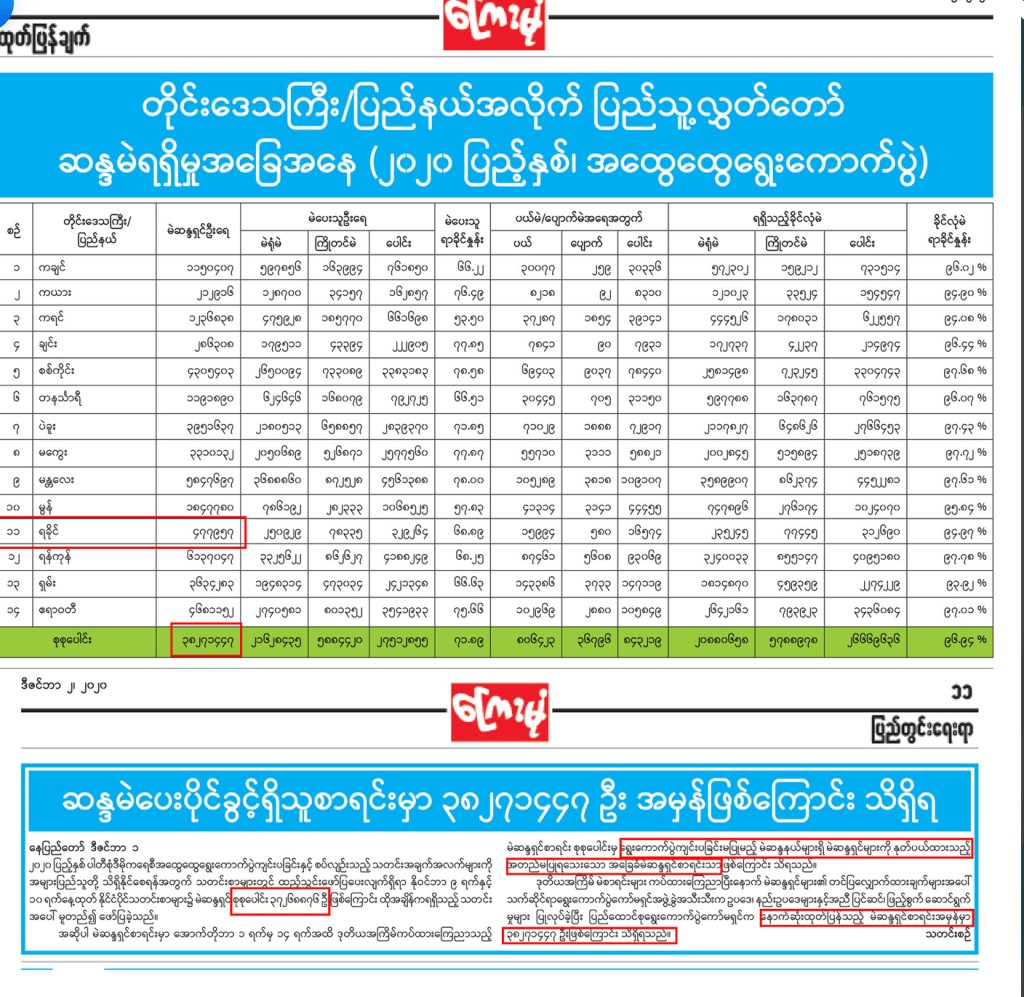 မဲပေးခွင့်ရှိသူအရေအတွက်မှာလည်း အစိုးရသတင်းစာတွေမှာ မဲပေးခွင့်ရှိသူ ၃၇. ၂ သန်း ကျော်လို့ ပြောတယ်။ ဒါပေမယ့် နောက်ဆုံးဖော်ပြတဲ့ ရွေးကော်စာရင်းချုပ်မှာတော့ မဲပေးခွင့် ရှိသူ ၃၈. ၂ သန်းကျော်ဖြစ်နေတယ်။ ဝိုင်းပြီးဝေဖန်တော့ ၃၇. ၂ သန်းက ပထမစာရင်းပဲ ရှိသေး တယ်။ စာရင်းမှန်မဟုတ်ဘူး၊ ၃၈.၂ သန်းက အမှန်အကန် နောက်ဆုံး စာရင်း လို့ သတင်းစာမှာ ကြေညာချက်ထည့်ပြီး ပြန်ဖြေရှင်းတယ်။