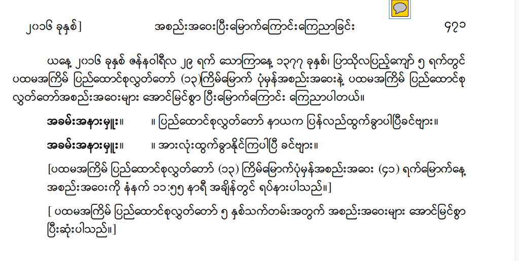 ၃။ ဒီတော့ နောက်ဆုံးမှာ လေးပုံတစ်ပုံက တောင်းဆိုတဲ့ စာကိုလက်ခံရရှိပါတယ်။ ဒါပေမယ့် ၁၅ ရက် ကြိုတင်ဖိတ်ကြားရမှာဖြစ်တဲ့အတွက် ဒုတိယအကြိမ်လွှတ်တော်သက်တမ်း အတွင်းမှာ အထူး အစည်းအဝေးကျင်းပဖို့ မဖြစ်နိုင်တော့ဘူးဆိုတာနဲ့ ပဲ ဇာတ်သိမ်းသွားမယ်ထင်ပါတယ်။