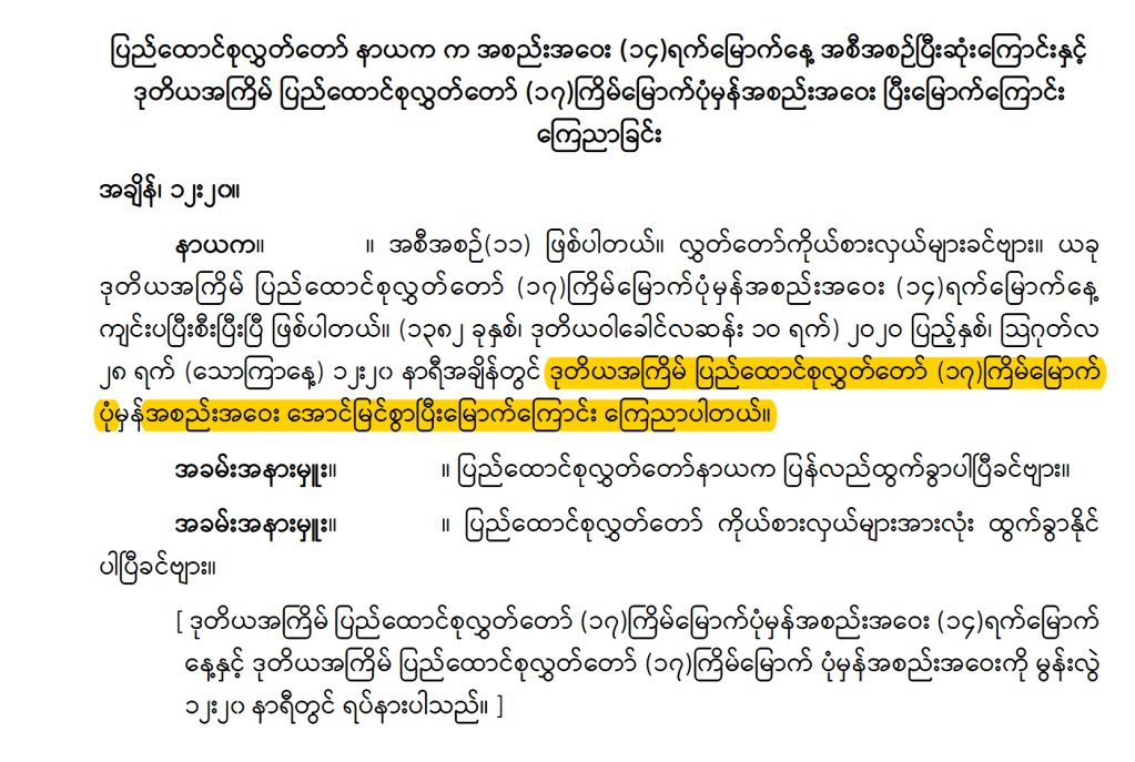 “ ဒုတိယအကြိမ် ပြည်ထောင်စုလွှတ်တော်၊ ၁၇ ကြိမ်မြောက် ပုံမှန်အစည်းအဝေး အောင်မြင်စွာ ပြီးမြောက်ကြောင်း” လို့ ပဲ ကြေညာခဲ့တယ်၊ ဒုတိယအကြိမ်ပြည်ထောင်စုလွှတ်တော် အစည်း အဝေးများ ပြီးဆုံးပြီလို့မပြောခဲ့ဘူး။ အစည်းအဝေးမှတ်တမ်းအဆုံးမှာလည်း ဒုတိယ အကြိမ် ပြည်ထောင်စုလွှတ်တော် သက်တမ်းငါးနှစ်အတွက် အစည်းအဝေးများ အောင်မြင်စွာ ပြီး ဆုံးပါသည်” လို့ ဖော်ပြထားတာလည်းမရှိဘူး။ ( ပုံ ၂ )