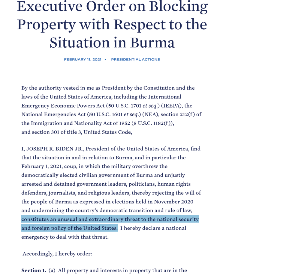 “မြန်မာနိုင်ငံမှာဖြစ်ပေါ်နေတဲ့အခြေအနေတွေဟာ အမေရိကန်နိုင်ငံရဲ့ အမျိုးသားလုံခြုံရေး နဲ့ နိုင်ငံခြားရေးမူဝါဒအပေါ် ပုံမှန်မဟုတ်သော ထူးထူး ခြားခြား ခြိမ်းခြောက်မှုတွေဖြစ်နေတယ်။”