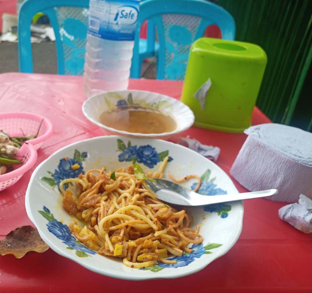 ကျွန်တော်ရောက်သွားတော့ အသုပ်ဆိုင်လေးက ခင်းတုန်း၊ ကျင်းတုန်း။ ဟင်းရည် အိုး က မီးဖိုပေါ်တင်ကာစ၊ ပလက်ဖောင်းပေါ်က ပလတ်စတစ်စားပွဲပေါ်မှာ ဂေါ်ဖီထုပ်တွေ လှီးချွတ်ပြီး ပုံ ထားတယ်။ အရပ် ခပ်ပျပ်ပျပ်၊ အသားညိုညို၊ အကျီ ၤ အညိုရောင်ရင့်ရင့် နဲ့ သက်လတ်ပိုင်း အမျိုးသမီးတစ်ယောက်က အထမ်းပေါ်မှာ ခေါက်ဆွဲဖတ်၊ မုန့်ဟင်းခါးဖတ်၊ တို့ဟူး စတဲ့ အမယ် စုံကို နေရာချနေတယ်။ သမီးငယ်လေးတစ်ယောက်က ဝိုင်းကူနေတယ်။