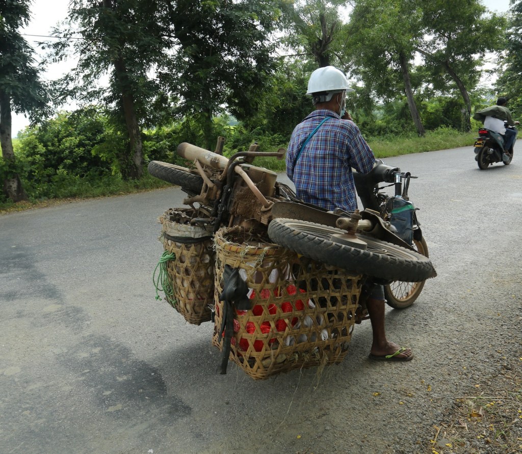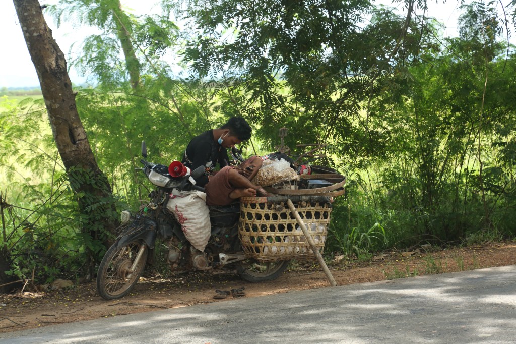 အဲဒီ ဆိုင်ကယ်သမားတွေ နဲ့ စကားပြောချင်ပေမယ့် သူတို့ ခရီးနှင်နေချိန်ဖြစ်လို့ ပြောဖို့ အခွင့် မသာခဲ့ဘူး။ အပြန်ခရီးမှာ ကြို့ပင်ကောက်မြို့ ကျော်လာတော့ လမ်းဘေးမှာ နားနေတဲ့ ပစ္စည်း အဟောင်းဝယ် ဆိုင်ကယ်တစ်စီးကို တွေ့တယ်။ တီရှပ်အမည်းရောင် နဲ့ လူငယ်လေးက ဆိုင် ကယ်ပေါ်မှာ ထိုင်ရင် ဖုန်းပွတ်နေတယ်။ ဆိုင်ကယ်နောက်က ခြင်းထဲမှာ သံထည် ပစ္စည်း အဟောင်းတွေ အပြည့်၊ စက်ဘီး ဖရိန်အဟောင်းပါသလို၊ လှည်းဘီးပတ်သံပြားအဟောင်း လည်း ပါတယ်။ ခြင်းတောင်းပေါ်မှာ မရွေးမုန့်ထုပ်အိတ်ကြီးတင်ထားပြီး ရှေ့ထိုင်ခုံကြားမှာတော့ ကြက် သွန်နီအိတ်တင်ထားတယ်။ ဆိုင်ကယ်လဲမသွားအောင် ဝါးလုံးနဲ့ထောက်ထားတယ်။
