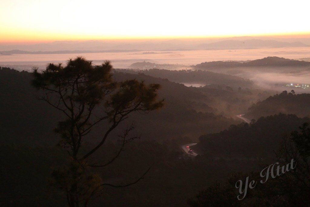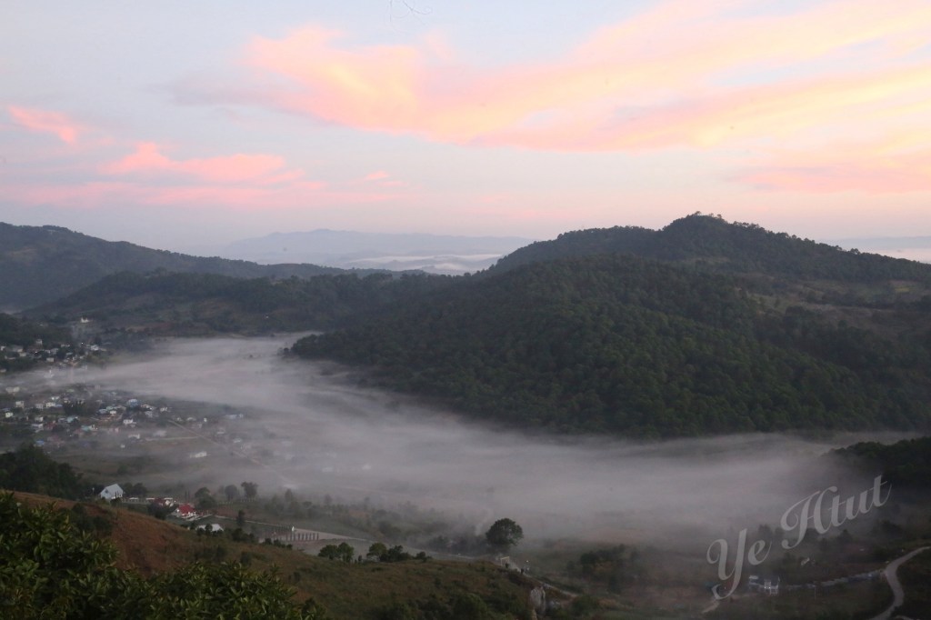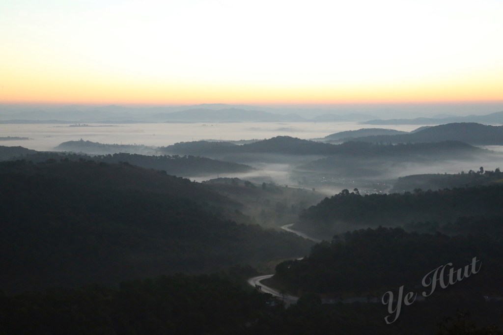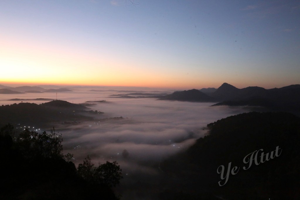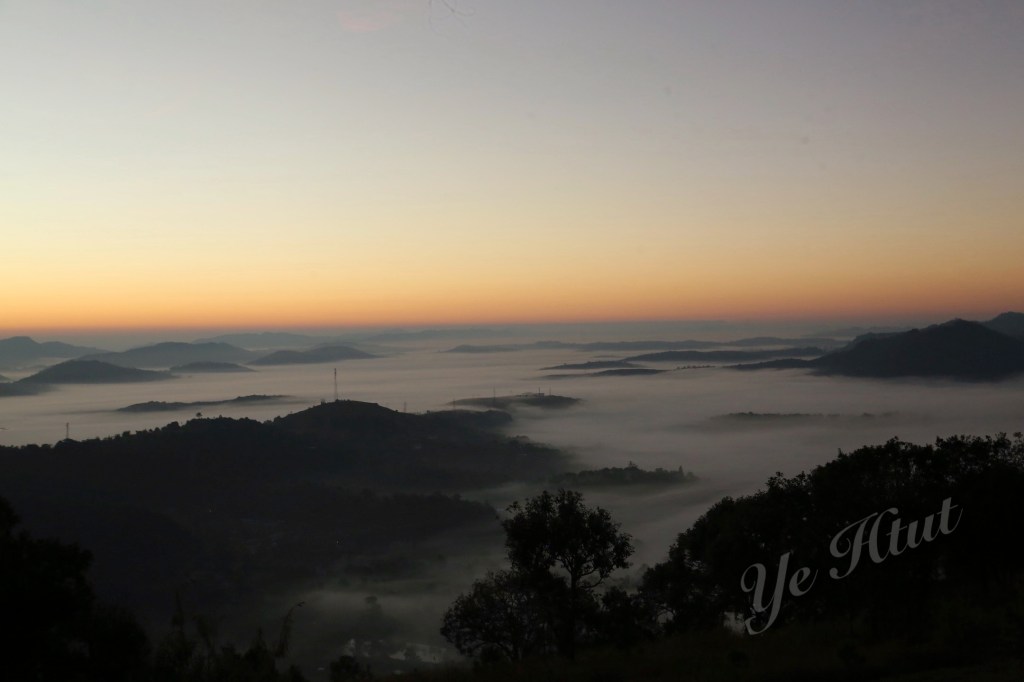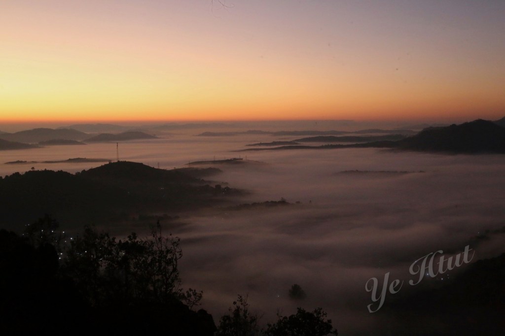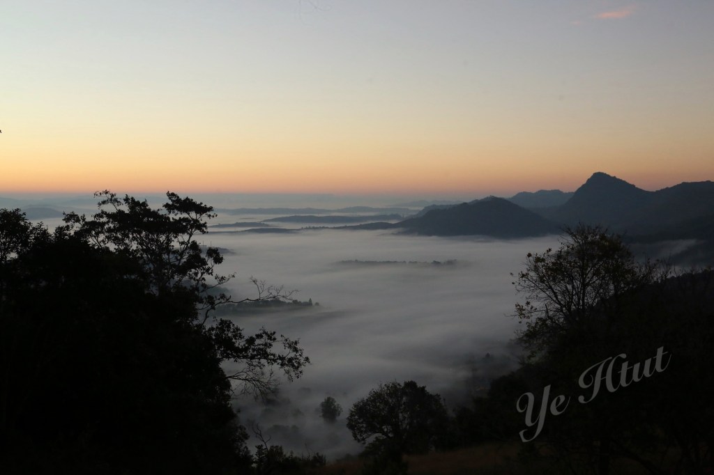 ဒါပေမယ့် အရှေ့ဘက်တောင်တန်းတွေပေါ်မှာ ရောင်နီသန်းလာတာနဲ့ အတူ အမှောင်ထုက တရွေ့ရွေ့ ဆုတ်ခွာသွားတယ်။ အဖြူရောင်တိမ်ပင်လယ် စဖြစ်လာတယ်။ ဒါပေမယ့် တိမ်ပင်လယ်က ဝုန်းဆိုပြီး ပေါ်လာတာမဟုတ်ဘူး။ အဝေးဆုံးနေရာမှာ မြူတွေဆိုင်းပြီး တိမ်ပင် လယ် စဖြစ်လာတယ်။ နောက် အဖြူရောင်ကော်ဇောကြီး ဖြန့်ချလိုက်သလို အိုးစည်တောင် ဘက် ကို တစ်ရွေ့ရွေ့နဲ့ ရောက်လာတယ်။ နောက်ဆုံး တောင်ခြေအောက်တည့်တည့်မှာ ရှိတဲ့ မီးရောင် တွေကို ဝိုးတဝါးပဲ မြင်ရတဲ့အထိ အဖြူရောင်ပင်လယ်ကြီးဖြစ်သွားတယ်။ ပင်လယ်ထဲကျွန်း လေး တွေလို ထိုးထွက်နေတဲ့ တောင်တွေက လွဲရင် ဘယ်နေရာ ကြည့်ကြည့် အဖြူရောင်၊ အရှေ့ ဘက် ကောင်းကင်မှာလည်း အလင်းရောင်။