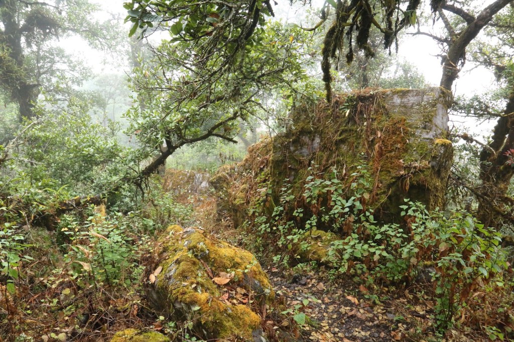 သုံးမြို့နယ် နယ်နမိတ်အမှတ်အသားကျောက်တိုင်ကို ရောက်တာနဲ့ တောင်တက်လမ်းက တောင် ကြောအတိုင်း နိမ့်လိုက်၊ မြင့်လိုက်နဲ့ အရှေ့မြင် အနောက်မြင် တောင်ခြေအထိ ခရီးဆက် သွား တယ်။ တောင်ကြောပေါ်မှာ တောင်ဇလပ်ပင်တွေရှိသလို အခြား အမြဲစိမ်း အပင်ကြီးတွေလည်း ရှိတယ်။ ရာသီဥတု အေးမြပြီး မြူတွေဆိုင်းနေလေ့ရှိတဲ့အတွက် သစ်ပင်ကြီးတွေရဲ့ ပင်စည် တွေ မှာ ရော၊ ကျောက်ဆောင်တွေမှာပါ ရေညှိတွေတက်နေ တယ်။
