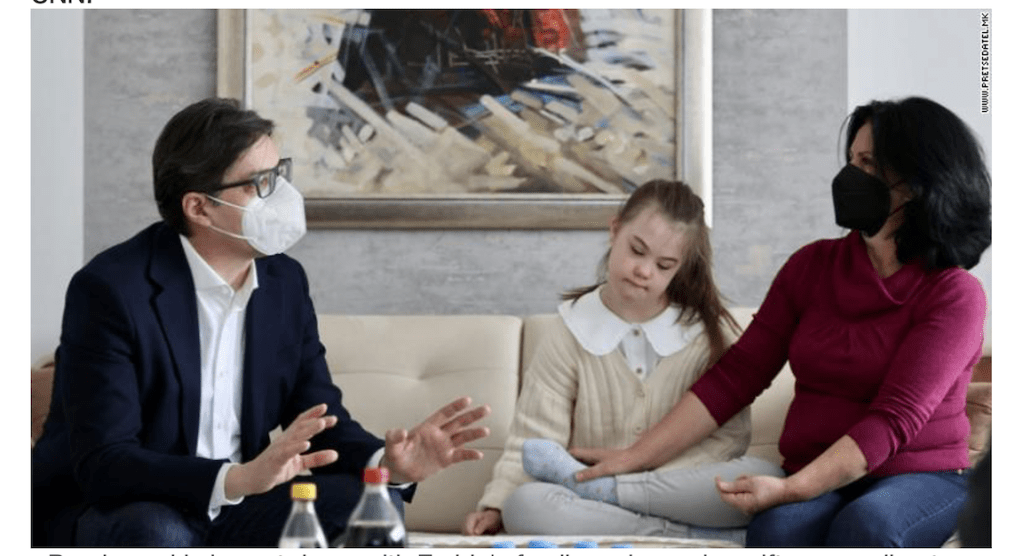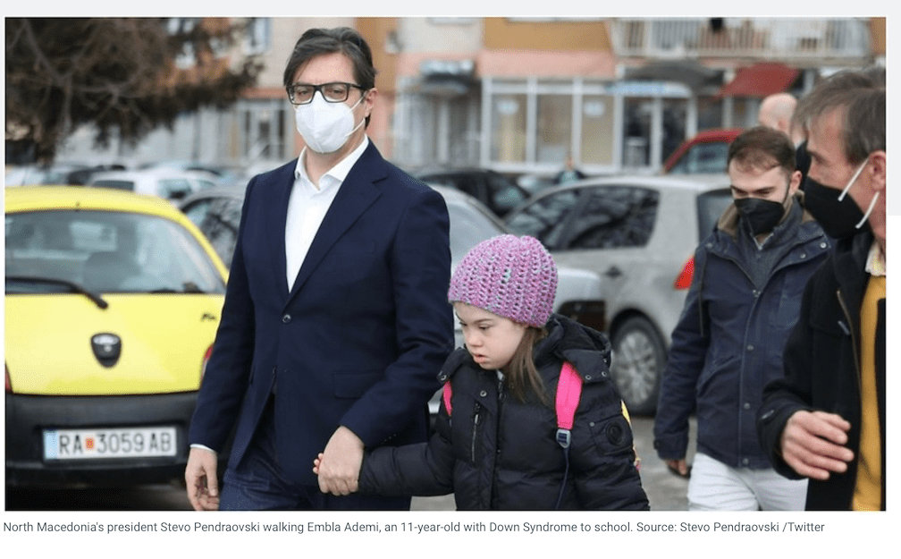 မြောက်ပိုင်း မက်ဆီဒိုးနီးယားနိုင်ငံ သမ္မတ Stevo Pendarovski ဟာ ဒေါင်း ရောဂါ လက္ခဏာ ခံစားနေရတဲ့ ၁၁ နှစ်အရွယ် ကျောင်းသူလေး တစ်ယောက်ကို လက်ဆွဲပြီး ကိုယ်တိုင် ကျောင်း ပို့ခဲ့တယ်။