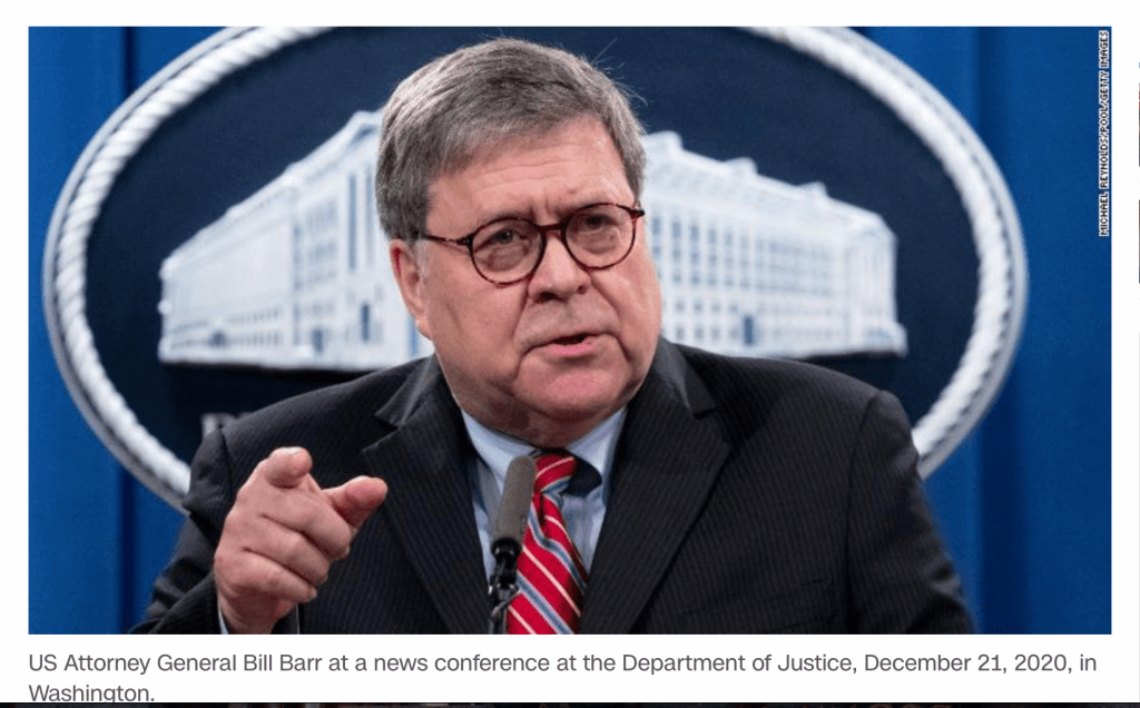 ၂၀၂၀ ပြည့်နှစ်ဒီဇင်ဘာ ၁ ရက်နေ့ အေပီသတင်းထောက်နဲ့တွေ့ဆုံ ဖြေကြားခဲ့ ချိန်မှာ ထရမ့် ပြောနေတဲ့ ရွေးကောက်ပွဲ မသမာမှုဆိုတာတွေနဲ့ပတ်သက်ပြီး ဘားရ်က ထရမ့် ပြောလို အုံနဲ့ ကျင်းနဲ့ စနစ်တကျ မဲခိုးခဲ့တယ်ဆိုတာကို သက်သေပြနိုင်တဲ့ ခိုင်လုံ တဲ့အထောက် အထား မရှိ ဘူး လို့ပြောခဲ့တယ်။