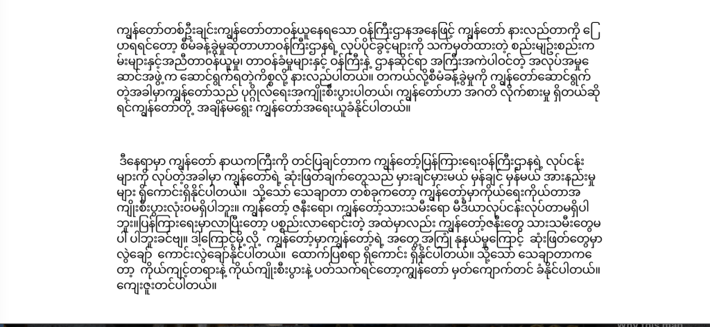 “သို့သော် သေချာတာ တစ်ခုကတော့ ကျွန်တော့်မှာကိုယ်ရေးကိုယ်တာ အကျိုးစီးပွား လုံးဝ မရှိ ပါဘူး။ကျွန်တော့်ဇနီးရော၊ကျွန်တော့်သားသမီးရောမီဒီယာလုပ်ငန်းလုပ်တာမရှိပါဘူး။ ပြန်ကြား ရေး မှာ လာပြီးတော့ ပစ္စည်းလာရောင်းတဲ့ အထဲမှာလည်း ကျွန်တော့်ဇနီးတွေ သားသမီး တွေမပါ ပါဘူး ခင်ဗျ။ ဒါ့ကြောင့်မို့လို့ ကျွန်တော့်မှာ ကျွန်တော့်ရဲ့ အတွေ့အကြုံ နုနယ်မှုကြောင့် ဆုံးဖြတ်ချက် တွေမှာ လွဲချော်ကောင်းလွဲချော်နိုင်ပါတယ်။ ထောက်ပြစရာ ရှိကောင်း ရှိနိုင်ပါတယ်။ သို့သော် သေချာတာ ကတော့ ကိုယ်ကျင့်တရားနဲ့ ကိုယ်ကျိုးစီးပွားနဲ့ ပတ်သက်ရင်တော့ ကျွန်တော် မှတ်ကျောက်တင် ခံနိုင်ပါတယ်။ကျေးဇူးတင်ပါတယ်။”