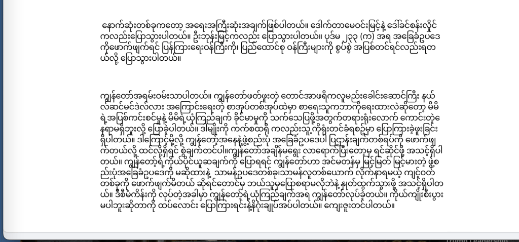 “ဒါကြောင့်မို့လို့ ကျွန်တော့်အနေနဲ့ ဖွဲ့စည်းပုံ အခြေခံဥပဒေပါ ပြဌာန်းချက်တစ်ရပ်ကို ဖောက်ဖျက် တယ်လို့ ထင်လို့ရှိရင် စွဲချက်တင်ပါ။ ကျွန်တော်အချိန်မရွေး လာရောက်ပြီးတော့မှ ရင်ဆိုင်ဖို့ အသင့်ရှိပါတယ်။ ကျွန်တော့်ရဲ့ ကိုယ်ပိုင်ယူဆချက်ကို ပြောရရင် ကျွန်တော်ဟာ အင်မတန်မှ မြင့်မြတ် မြင့်မားတဲ့ ဖွဲ့စည်းပုံ အခြေခံဥပဒေကို မဆိုထားနဲ့ သာမန်ဥပဒေတစ်ခု၊ သာမန် လူတစ်ယောက် လိုက်နာရမယ့် ကျင့်ဝတ်တစ်ခုကို ဖောက်ဖျက်မိတယ် ဆိုရင်တောင်မှ ဘယ်သူမှ ပြောစရာမလိုဘဲနဲ့ နုတ်ထွက်သွားဖို့ အသင့်ရှိပါတယ်။ ဒီစီမံကိန်းကို လုပ်တဲ့အခါမှာ ကျွန်တော့်ရဲ့ ယုံကြည်ချက်အရ ကျွန်တော်လုပ်ခဲ့တယ်။ ကိုယ်ကျိုးစီးပွား မပါဘူးဆိုတာကို ထပ်လောင်း ပြောကြားရင်းနဲ့ နိဂုံးချုပ်အပ်ပါတယ်။ ကျေးဇူးတင်ပါတယ်။”