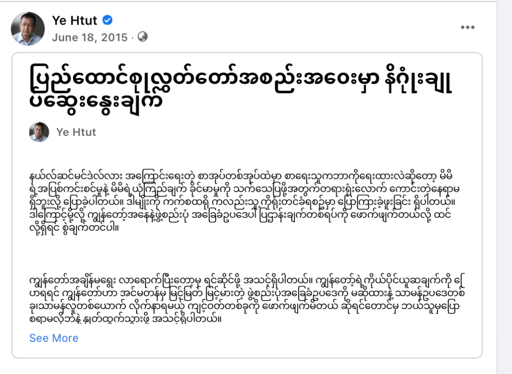 ၁။ ကျွန်တော့်ရဲ့ လွှတ်တော်သို့ တင်ပြချက် https://www.facebook.com/notes/376818446997205/