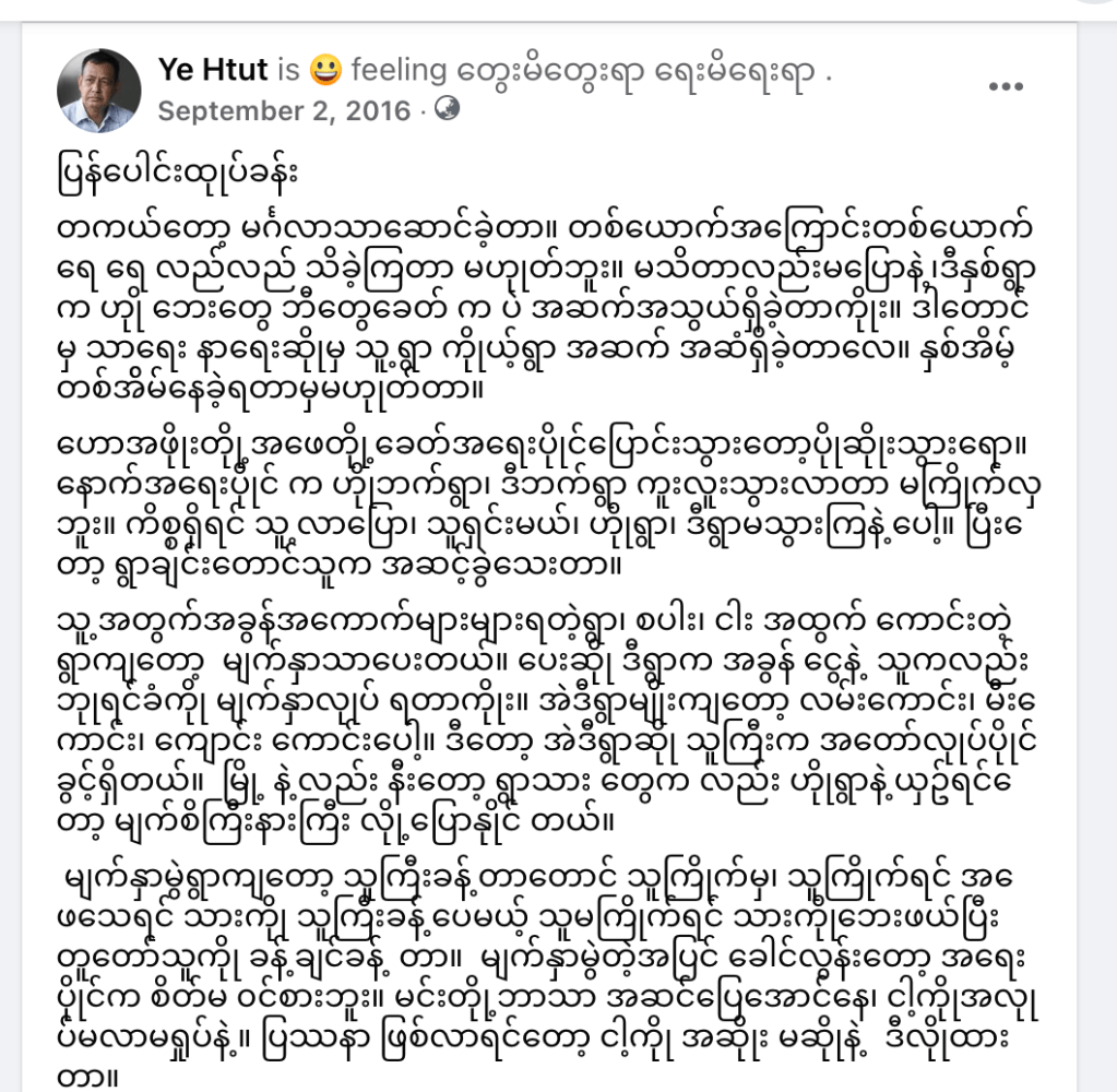 တိုက်တိုက်ဆိုင်ဆိုင် ပြန်တက်လာတဲ့ လွန်ခဲ့တဲ့ ခြောက်နှစ် ၂၀၁၆ ခုနှစ် စက်တင်ဘာ ၂ ရက်နေ့မှာ ရေးခဲ့တဲ့စာ