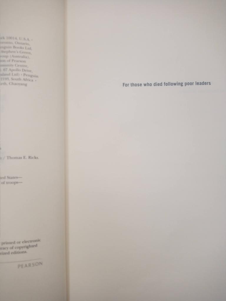စာရေးသူကတော့ အရည်အချင်းညံ့ဖျင်းတဲ့ ဗိုလ်ချုပ်တွေနဲ့ပတ်သက်ရင် ပြင်းထန်တဲ့ ခံစားချက် ရှိပုံရတယ်။ သူ့စာအုပ်ကို “ ညံ့ဖျင်းသောခေါင်းဆောင်များလက်အောက်တွင် တာဝန်ထမ်းဆောင် ရင်း ကျဆုံးခဲ့ရသူများ အတွက်” ( “For those who died following poor leaders”) ဆိုပြီး ရည်ညွန်းထားတယ်။