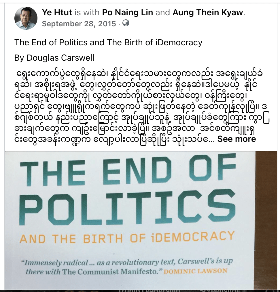 ဒီမိုကရေစီစနစ်ကို ဖော်ဆောင်မယ်လို့ ပြောရင် iDemocracy အကြောင်းတော့ နည်းနည်း သိ ထားသင့်တယ်လို့ ယူဆတဲ့အတွက် စာအုပ်ဖတ်ညွှန်းလေးကို ပြန်မ ျှဝေလိုက်ပါတယ်။