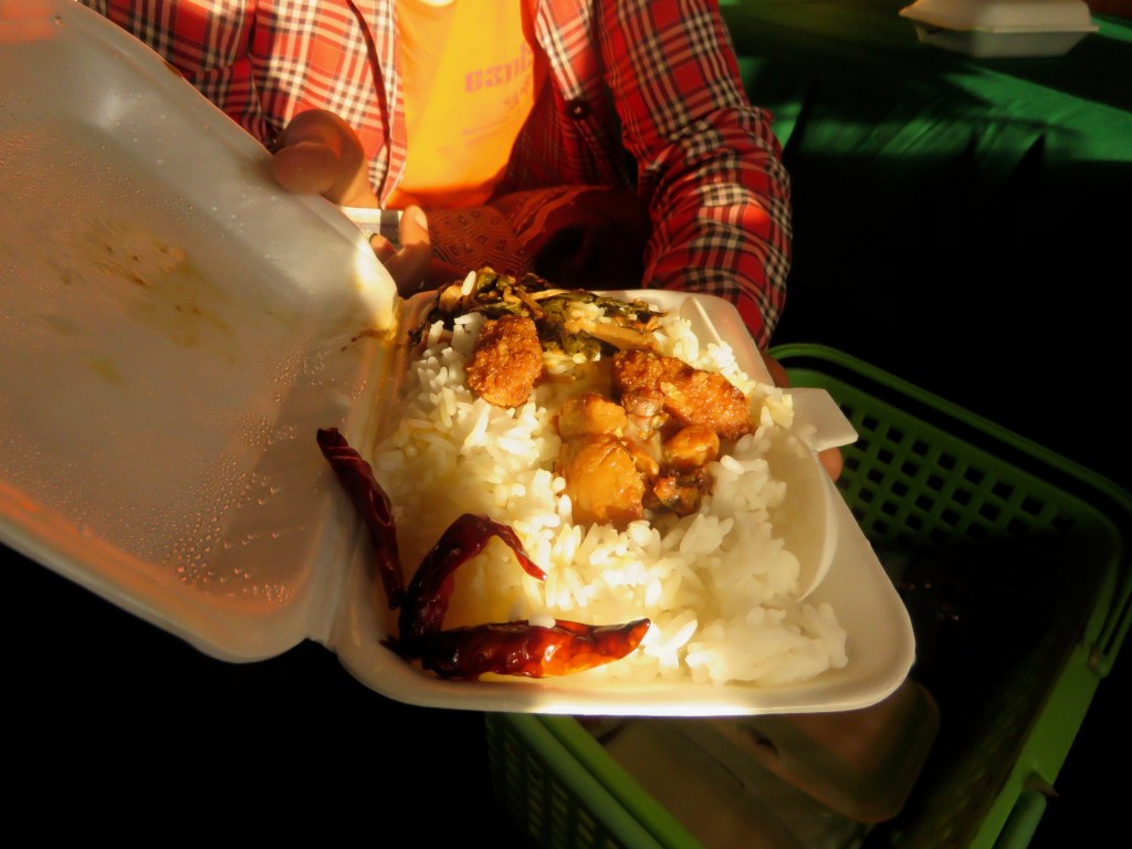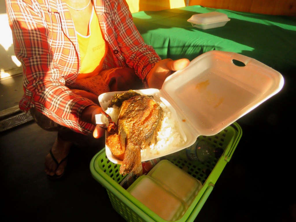 တပ်ကုန်းရောက်တော့ ရထားဈေးသည်တွေတက်လာတယ်။ ထမင်းဆီဆမ်း ငါးကြော်၊ ကြက်ဥကြော်၊ ကြက်သားကြော် ကြိုက်တာနဲ့ ယူ ၁၀၀၀ ပဲ။ ငရုတ်သီးကြော်သုံးလေး တောင်နဲ့ ချဉ်ပေါင်ကြော်လေးတောင် ပါသေးတယ်။ ( ဓာတ်ပုံတွေမှာကြည့်ပါ။ ) သူတို့ဆီက ငါးကြော်နဲ့ တစ်ပွဲဝယ်စားတယ်။ ထမင်း က စားသောက်တွဲကရောင်းတဲ့ ပွဲလောက်မများတာကလွဲရင် သူတို့ ထမင်းဆီဆမ်း၊ ငါးကြော်၊ ချဉ်ပေါင်ကြော်အတွဲက ပိုတောင်ခံတွင်းပေါက်သေးတယ်။ တစ်ထောင် တန်တယ်လို့ ပြောရမှာပဲ။ ကော်ဖီသောက်ရင် တစ်ခွက်သုံးရာ။