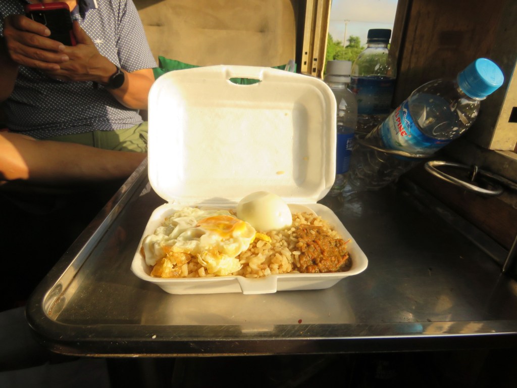 စားသောက်တွဲက အစားအသောက်နဲ့ ရထားဈေးသည် အစား အသောက် ယှဉ်စားချင်တာနဲ့ ထမင်းဆီဆမ်း၊ ကြက်ဥမွှေကြော်၊ ကော်ဖီတစ်ခွက်မှာလိုက် တယ်။ ထမင်း ဆီဆမ်း( ဘုရားစူး ဆီပါတယ်ဆိုရုံလေး) အလွတ်တစ်ပွဲက ၁၅၀၀၊ ကြက်ဥမွှေကြော် ( နှစ်လုံး)က ၂၀၀၀ ၊ ကော်ဖီတစ်ခွက် က ငါးရာ။ စားသောက်တွဲ နံနက်စာက လေးထောင် ကုန်တယ်။ ထမင်းကြော် လည်း ၃၅၀၀ ပဲတဲ့။