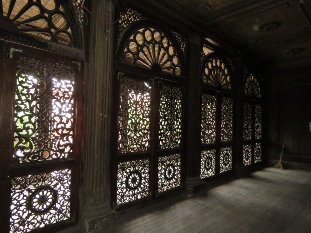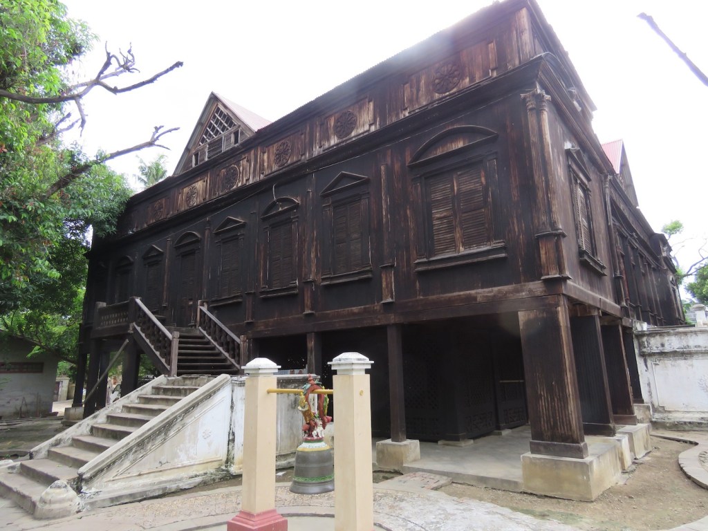 ကျောင်းအောက်ထပ်မှာလည်း သစ်သားတန်းတွေကို ရာဇမတ်ကွက်ကာပြီးပိတ်ထားတယ်။ အထဲ မှာတော့ ပစ္စည်းအဟောင်းတွေ ထည့်ထားတယ်။ ချက်ပြုတ်ရေးပစ္စည်းတစ်ချို့လည်းတွေ့တယ်။ ကျောင်းအောက်မှာ ပက်လက်ကုလားထိုင်တစ်လုံးနဲ့ စာဖတ်နေတဲ့ ဦးဇင်းတစ်ပါးကို ကျောင်းပေါ် တက်လို့ရမရမေးတော့ အရှေ့ဘက်လှေကားက တံခါးစေ့ထားတယ်၊ ဝင်ကြည့်လိုရတယ် ပြော တဲ့ အတွက် အပေါ်တက်ကြည့်တယ်။ အဝင်ဝမှာ ဖိနပ်မစီးရဆိုတဲ့ ဆိုင်းဘုတ်တွေ့တယ်။ အထဲမှာ မီး အလင်းရောင်မရှိတဲ့အတွက် အတွင်းပိုင်းရှုခင်းတွေကို သေသေချာချာမမြင်ရဘူး။