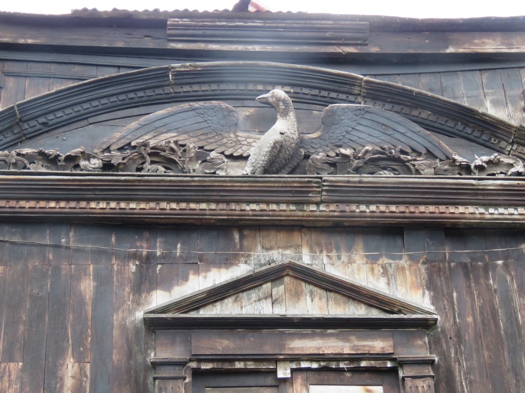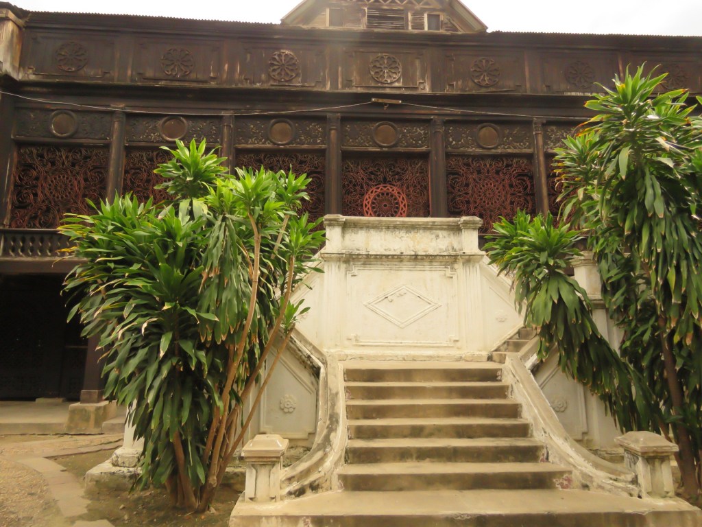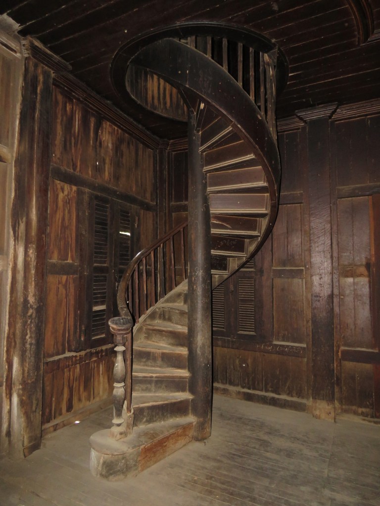 အတွင်းမှာရှိတဲ့ အခန်းတံခါးတွေ၊ မျက်နှာကြက်နဲ့ တံခါး ပေါင်းကူးအခုံးတွေမှာ ရှိတဲ့ပန်းပုလက်ရာ တွေ က အနောက်တိုင်းဟန်နွယ်တဲ့လက်ရာတွေဖြစ်ပါတယ်။ ရှေးခေတ်ဘုန်းတော်ကြီးကျောင်း တွေမှာ တွေ့ရတဲ့ ဇာတ်တော်ပန်းပုရုပ်ကြွတွေတော့မတွေ့ခဲ့ရဘူး။ ( မှောင်နေတဲ့အတွက် ရှာမ တွေ့တာလည်းဖြစ်နိုင်ပါတယ်။ ) အနောက်ဘက်ဝင်ပေါက်ဘက်က အခန်းတစ်ခုထဲမှာ ကြောင်လိမ် လှေကားတစ်ခုတွေ့တယ်။ သစ်သားတိုင်တစ်လုံးတည်းကို စရွေးဖောက်ပြီး သစ်သားလှေကားထစ် တွေနဲ့ ဆောက်လုပ်ထားတာ လက်ရာမြောက်လှပါတယ်။ လှေကားအတိုင်းအပေါ်တက်သွားတော့ အထပ်ခိုးထဲရောက်သွားတယ်။ အထပ်ခိုးက ကျောင်းတိုက်တစ်ခုလုံးရဲ့ မျက်နှာကြက်ပါပဲ။ အလယ်မှာ အခန်းဖွဲ့ထားတယ်လို့ထင်ရတဲ့ တိုင်လုံးကြီးတစ်ခုရှိတယ်။ ဘာအတွက်လည်းဆို တာ တော့ ခန့်မှန်းလို့မရဘူး။