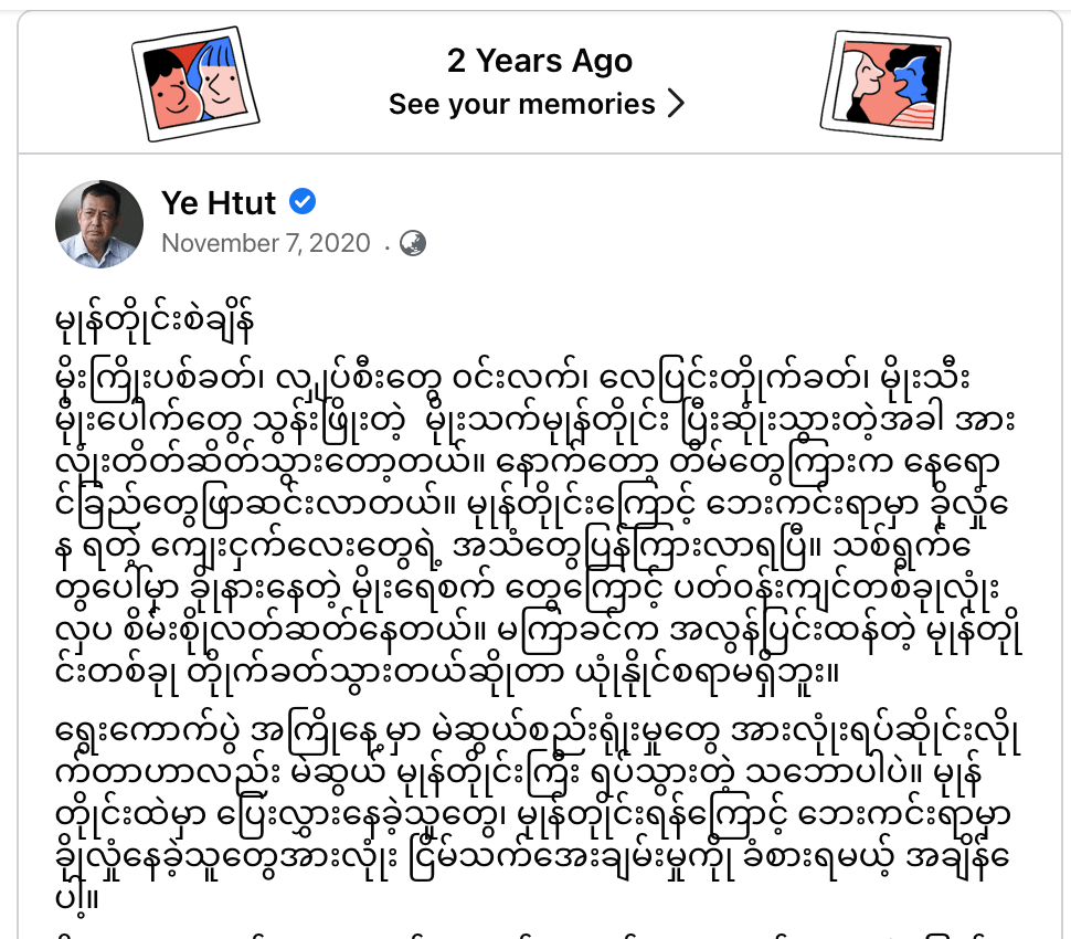 လွန်ခဲ့တဲ့ နှစ်နှစ် ၂၀၂၀ ပြည့်နှစ် နိုဝင်ဘာလ ၇ ရက်နေ့ ရွေးကောက်ပွဲ မကျင်းပမီ တစ်ရက်အလို မှာ “ မုန်တိုင်းစဲချိန်” ဆိုပြီး ဆောင်းပါးတစ်ပုဒ်ရေးခဲ့ပြီး အခုလို တိုက်တွန်းခဲ့တယ်-