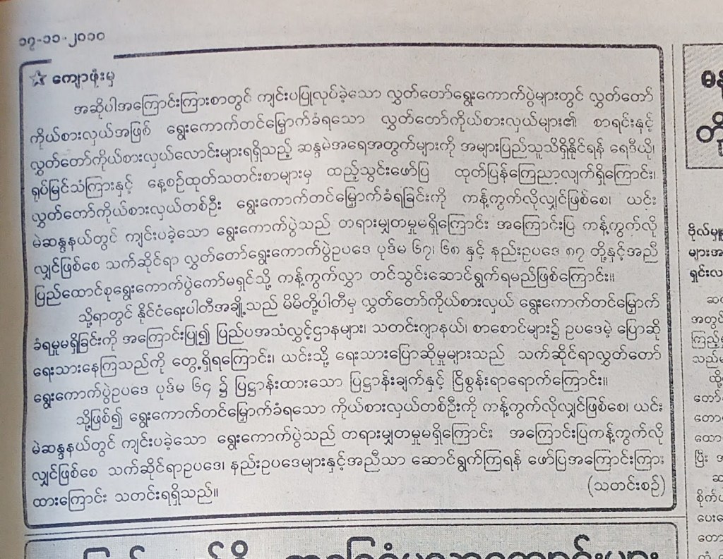 အဲဒီထဲက မှတ်မှတ်ရရ ဖြစ်ရတဲ့ဆောင်းပါးတစ်ပုဒ်ကတော့ ၁၂-၁၁-၂၀၁၀ ရက်နေ့ နိုင်ငံပိုင် သတင်းစာတွေမှာဖော်ပြခဲ့တဲ့ “ လက်ဆွဲနှုတ်ဆက်ချီတက်ကြပါစို့” ( ဥပဒေလေ့လာသူတစ်ဦး) ဆောင်းပါးပဲဖြစ်ပါတယ်။