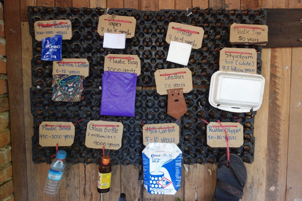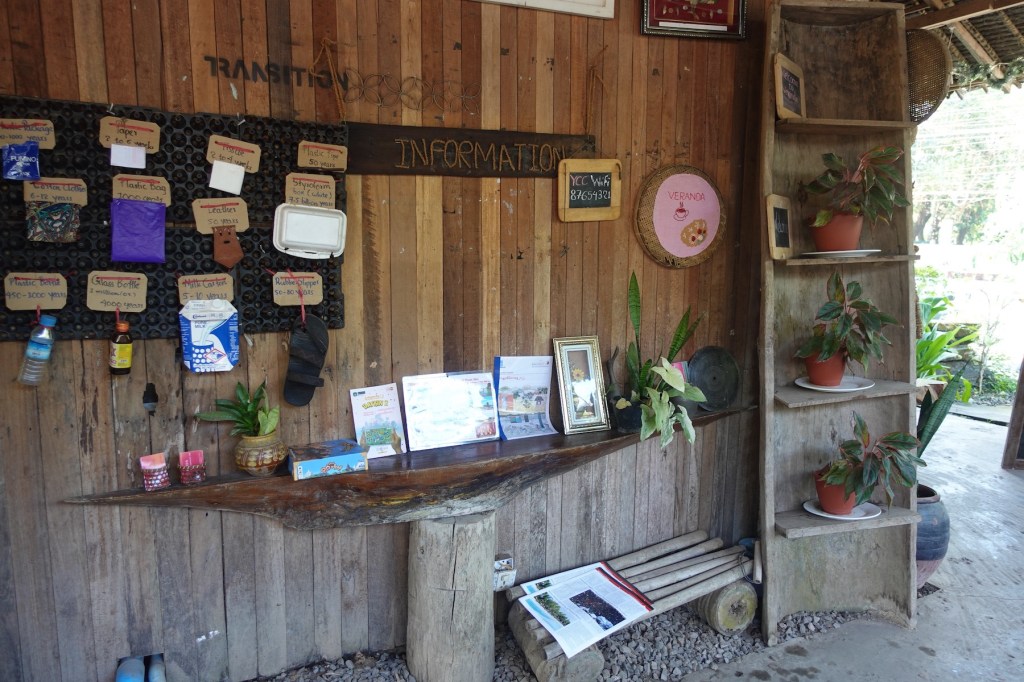ဒီဆိုင်ပြင်ဆင်ထားရှိမှုကို မြင်လိုက်တာနဲ့ ဒီဆိုင်ဟာ သဘာဝပတ်ဝန်းကျင်ထိန်းသိမ်းရေး နဲ့ ရိုး ရာအမွေအနှစ်ထိန်းသိမ်းရေးကို ဦးစားပေးတယ်ဆိုတာ သိနိုင်တယ်။ ဆိုင်အဝင်မှာ စွန့်ပစ် ပစ္စည်းတွေကို တွဲလောင်းဆွဲပြီး ပစ္စည်းတစ်ခုချင်း ပျက်စီးသွားဖို့ လိုအပ်တဲ့အချိန်ကာလတွေ ကို ရေးထားတယ်။ ဥပမာ၊ စာရွက် နှစ်ပတ်မှ ခြောက်ပတ်၊ နွားနို့ဘူး ငါးနှစ် မှ ဆယ်နှစ်၊ ရေသန့် ဘူး နှစ် လေးရာ့ငါးဆယ် မှ နှစ်တစ်ထောင် စသည်ဖြင့်။ သီးသန့် ပန်းချီတွေ၊ဒီဇိုင်းတွေ မလုပ်ပဲ နဲ့ တကယ့်ပစ္စည်းလေးကို သုံးပြီး အသိပညာပေးထားတဲ့ စိတ်ကူးက ကောင်းလွန်းလှတယ်။
