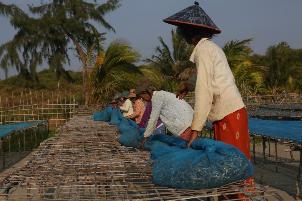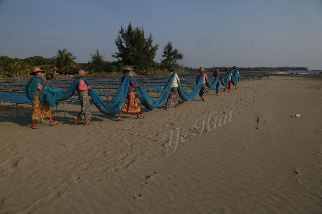 ငွေတောင်ကမ်းခြေ ဈေးဆိုင်တန်းတွေကို ကျော်ပြီး ဆက်သွားရင်ကမ်းခြေအဆုံးနေရာမှာ ငါးလှန်း တဲ့တဲတွေရှိတယ်။ အဲဒီမှာ ငါးနီတူခြောက်တွေကို စင်တွေနဲ့ လှမ်းထားတယ်။ အမျိုးသမီးကြီးတွေ က စင်ပေါ်မှာ လှမ်းထားတဲ့ ငါးတွေကို စုပြီး သယ်ဖို့လုပ်နေကြတယ်။ သူတို့က စင်တစ်ခုပေါ်မှာ ရှိတဲ့ ငါးတွေကို ခင်းထားတဲ့ ပိုက်ကနေမပြီး ဘေးက စင်ပေါ်မှာ ရှိတဲ့ငါးတွေနဲ့ ပေါင်းတယ်။ နောက် စင်တစ်ခုက ငါးတွေကိုလည်း အဲဒီအတိုင်းလုပ်တယ်။ အဲဒီလို စုလိုက်တဲ့ ငါးတွေများလာတဲ့အခါ သူတို့ အားလုံးတန်းစီပြီး ခင်းထားတဲ့ပိုက်ကို လိပ်လိုက်တော့ ငါးတွေကို ပိုက်နဲ့ ထုပ်ထားသလို ဖြစ်သွား တယ်။ အဲဒီတော့မှာ အဲဒီပိုက်အရှည်ကို အားလုံးဝိုင်းထမ်းပြီး တဲဆီကို သယ်သွားကြ တယ်။ သူတို့ သယ်သွားတဲ့ပုံက စပါးကြီးမြွေကြီးတစ်ကောင်ကို ဝိုင်းထမ်းသွားတာနဲ့တူတယ်။ သူတို့လုပ်တာအဆင့်ဆင့်ကို အခုတင်ပေးထားတဲ့ ဓာတ်ပုံတွေမှာ ကြည့် ရင်ပိုရှင်းတယ်။