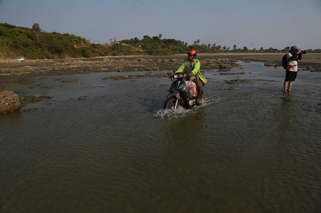 မော်တင်စွန်းကနေ ငွေတောင်ကမ်းခြေကို သွားတဲ့လမ်းနှစ်လမ်းရှိတယ်။ ကမ်းခြေအတွင်းဘက်က ကားလမ်းနဲ့ ရေကျတဲ့အချိန် သောင်ပြင်အတိုင်းသွားတဲ့လမ်း၊ ကျွန်တော်တို့က ရေကျနေချိန် ဖြစ် တဲ့အတွက် ဆိုင်ကယ်နဲ့ ကမ်းခြေအတိုင်းသွားခဲ့တယ်။ တစ်ချို့ကားတွေလည်း ကမ်းခြေအတိုင်း မောင်းတာတွေ့တယ်။ ဒါပေမဲ့ လမ်းမှာ ရေချောင်းတစ်ခုဖြတ်ရတယ်၊ ရေတိမ်ပေမယ့် ပင်လယ်ရေငံ ဝင်တဲ့ ချောင်းတွေဖြစ်နေတော့ ကားအောက်ပိုင်း ဆားငံရေထိမှာကိုတော့ ထည့်တွက်ရမယ် ထင် တယ်။ ကားလမ်းအတိုင်းသွားရင်တော့ တံတားရှိတဲ့အတွက် ရေထဲဖြတ်ဖို့မလိုဘူး။