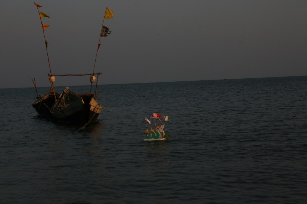 အမ ျှပေးဝေပြီးတော့ အလှူရှင်တွေလည်း ကိုယ်ဆုတောင်းချင်တာဆုတောင်းပေါ့။ တချို့က တော့ စိတ်ထဲက ဆုတောင်းတယ်။ တချို့က အသံထွက်ပြီးဆုတောင်းတယ်။ အားလုံးကျေနပ်ပြီ ဆိုတဲ့ အခါ ပူဇော်ပသပေးတဲ့ ပုဂ္ဂိုလ်ရဲ့ အကူလူတစ်ယောက်က ဖောင်တော်ကို ကိုင်ပြီး ပင်လယ်ထဲ ဆင်း တယ်။ ခါးလောက်ရောက်တော့ ဖောင်တော်ကို ပင်လယ်ထဲကို မျောလိုက်တယ်။ နဂါးစာပူဇော်တဲ့ အချိန်က ရေကျနေချိန်မှာ လုပ်လေ့ရှိတော့ ဖောင်တော်က ရေကျနဲ့ အတူ ပင်လယ်ထဲကို တရွေ့ ရွေ့မျောပါသွားတယ်။ ကျွန်တော်တို့ မှတ်တမ်းတင်တာကို ကြည့်နေတဲ့ အလှူရှင်တစ်ယောက်က တော့ ဒီရေတက်ရင် ပင်လယ်ထဲက ပစ္စည်းတွေ ကမ်းပေါ်လာတင်ပေမယ့် ဖောင်တော်တွေ က တော့ ဘယ်တော့မှ ပြန်ပါမလာဘူးလို့ ရှင်းပြတယ်။ သူပြောတာမှန်/ မမှန် လေ့လာချိန်မရခဲ့ဘူး။