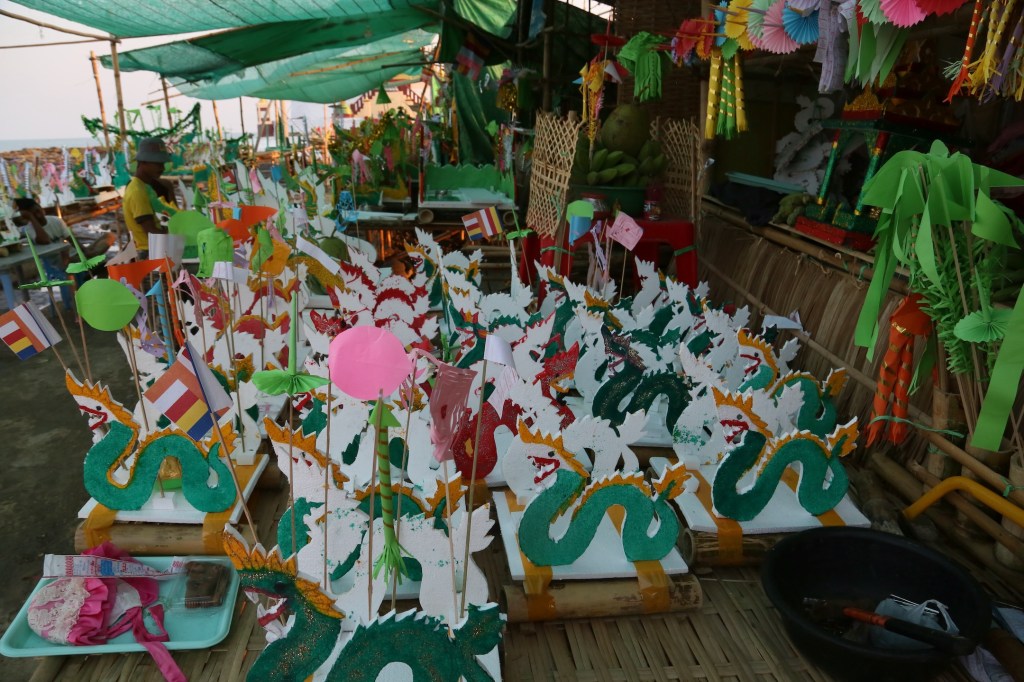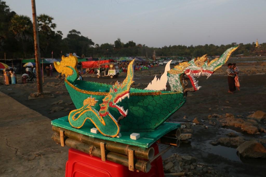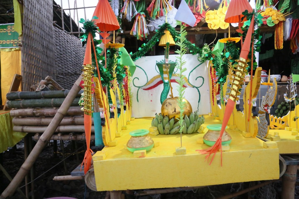 ဈေးတန်းပတ်ဝန်းကျင်မှာ ဝါးလုံးတွေပုံပြီး ဖောင်ဖွဲ့ပေးနေတဲ့ ဦးကြီးတစ်ယောက်ကို မေးကြည့်တော့ ဘုရားပွဲ ၁၅ ရက် ဆိုင်ရှင်က ကုန်ကြမ်းပေး၊ စရိတ်ငြိမ်း ခု နစ်သောင်းရတယ်တဲ့။ နဂါးရုပ်ဖော်တဲ့သူ၊ ရွတ်ဖတ်ပူဇော်တဲ့သူတွေကို မေးချင်ပေမယ့် အရုပ်တွေလုပ်ရတာ၊ ဘုရားဖူးတွေအတွက် နဂါးစာ ကျွေး ပေးနေရတာနဲ့ အလုပ်ရှုပ်နေလို့မေးခွင့်မရခဲ့ဘူး။