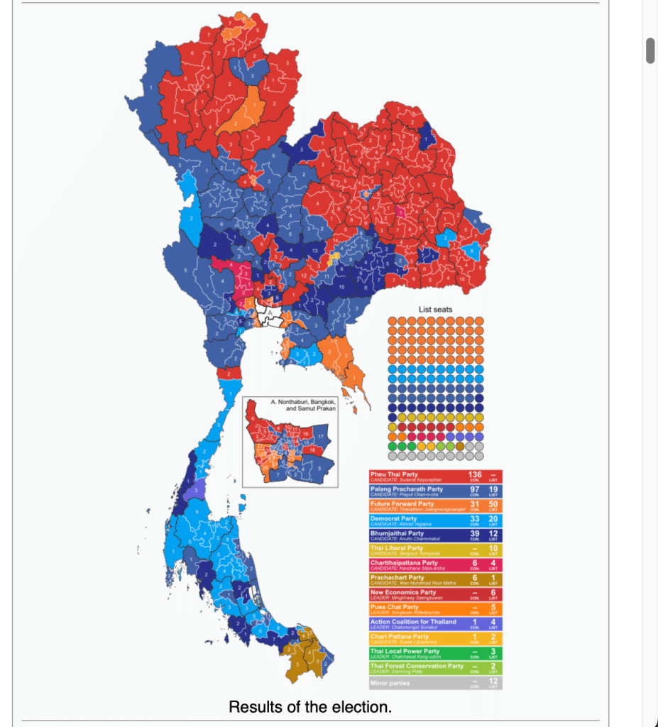 ၂၀၁၉ ခုနှစ်ရွေးကောက်ပွဲမှာ သက်ဆင်ထောက်ခံသူတွေရဲ့ ဖွေ့ထိုင်းပါတီက တိုက်ရိုက်နဲ့ အချိုးကျ အမတ် ၁၃၆ နေရာ အနိုင်ရတယ်။ ပရာယွတ်ကို ဝန် ကြီးချုပ်လောင်းအဖြစ် အဆိုပြုထားတဲ့ Palang Pracharath Party က ၁၁၆ နေရာနိုင်တယ်။ လူငယ်တွေ ဦးဆောင်တဲ့ Future Forward Party ( အခု ၂၀၂၃ ရွေးကောက်ပွဲမဲအများဆုံးရတဲ့ Move Forward party ရဲ့ အရင်အမည်) က ၈၁ နေရာနိုင်တယ်။ သက်တမ်းရင့် ဒီမိုကရက်ပါတီက ၅၃ နေရာနိုင်တယ်။ Bhumjaithai Party ပါတီက ၅၁ နေရာနိုင်တယ်။ ပါတီအလိုက်မဲရရှိမှုကို ပုံမှာ ကြည့်ပါ။ ဖွေ့ထိုင်းပါတီက အနီရောင်ဖြစ်ပါတယ်။
