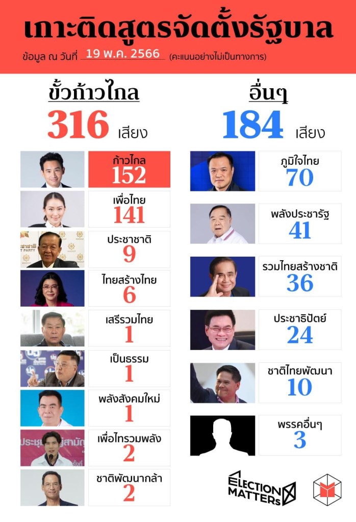 မေ ၁၉ ထိုင်း TV CH 3 သတင်းမှာတော့ အောက်လွှတ်တော်အမတ် ၅၀၀ မှာ Move Forward ခေါင်းဆောင်တဲ့ ပါတီ ၉ ခုက ၃၁၆ မဲ၊ ပရာယွတ်ဘက်က ပါတီ ၆ ခု ၁၈၄ မဲရနေ ပြီလို့ ပါလာ တယ်။ မဲအသေးစိတ်ကို ပုံမှာ လေ့လာနိုင်ပါတယ်။