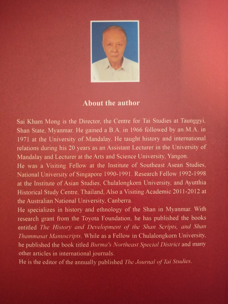 မိတ်ဆွေတစ်ယောက်က ညွှန်းလို့ ရှမ်းပြည်နယ် သမိုင်းနဲ့ပတ်သက်တဲ့ စာအုပ် သုံးအုပ် ဝယ်လိုက် တယ်။ စာရေးသူ ဆရာ စိုင်းခမ်းမိုင်း က မန္တလေးတက္ကသိုလ် သမိုင်းဌာနမှာ နည်းပြဆရာအဖြစ် စတင်တာဝန်ထမ်းဆောင်ခဲ့ပြီး ၁၉၈၉ ခုနှစ်မှာ ရန်ကုန်တက္ကသိုလ် နိုင်ငံတကာ ဆက်ဆံရေး ပညာ ဌာန ကထိက အဆင့်ကနေ နုတ်ထွက်ခဲ့သူဖြစ်ပါတယ်။ အဲဒီနောက်မှာတော့ စင်္ကာပူအမျိုးသား တက္ကသိုလ်၊ ထိုင်းနိုင်ငံ ချူလာလောင်ကွန်တက္ကသိုလ် နဲ့ သြစတေးလျ အမျိုးသားတက္ကသိုလ်တွေ မှာ သုတေသနပညာရှင်အဖြစ် တာဝန်ထမ်းဆောင်ခဲ့ပါတယ်။ လက်ရှိအချိန်မှာတော့ တောင်ကြီးမြို့ အခြေစိုက် ရှမ်းသုတေသန စင်တာရဲ့ အမှုဆောင်ဒါရိုက်တာနဲ႕ နှစ်စဉ်ထုတ်ဝေတဲ့ ရှမ်းသုတေသန စာ စောင်ရဲ့ အယ်ဒီတာ အဖြစ် တာဝန်ယူထားပါတယ်။ ဆရာ့ကိုယ်ရေးသမိုင်းအပြည့်အစုံကို ဓာတ်ပုံ မှာ လေ့လာနိုင်ပါတယ်။