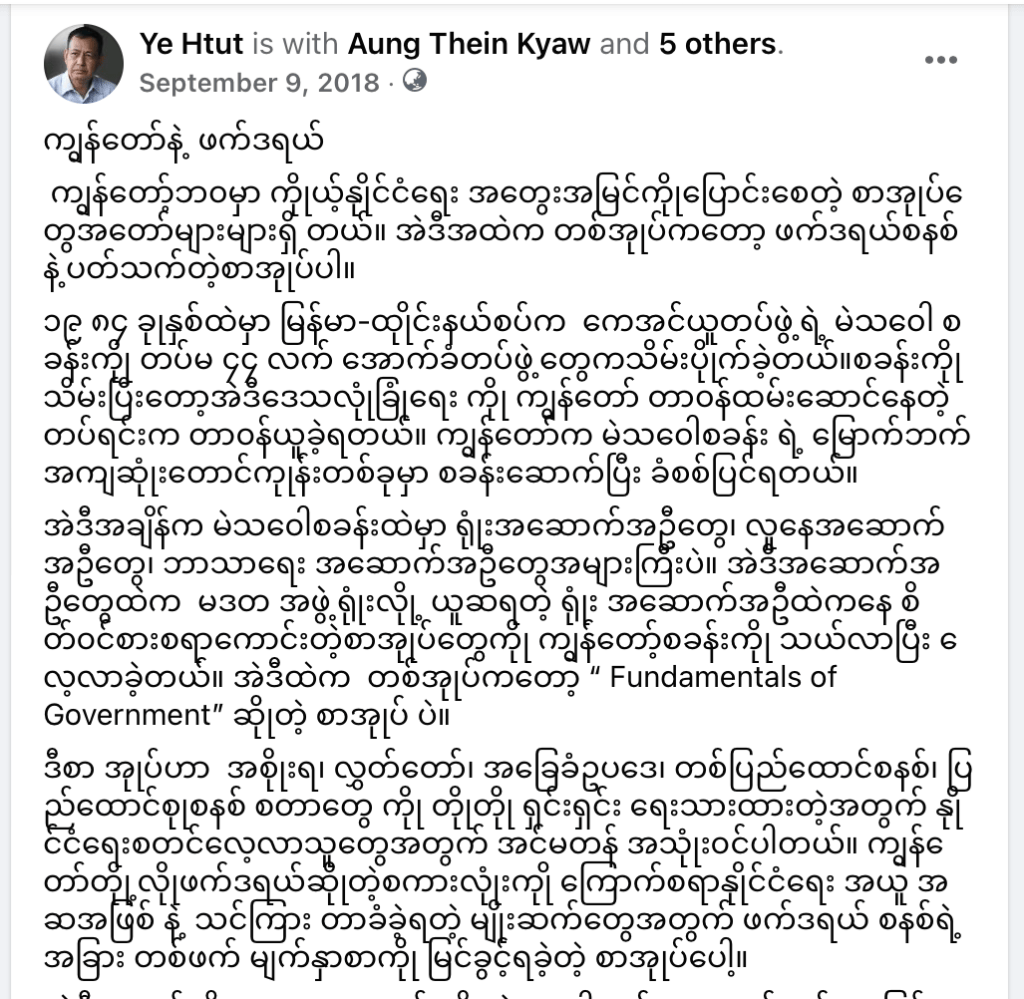 အဲဒီအချိန်က မဲသဝေါစခန်းထဲမှာ ရုံးအဆောက်အဦတွေ၊ လူနေအဆောက်အဦတွေ၊ ဘာသာရေး အဆောက်အဦတွေအများကြီးပဲ။ အဲဒီအဆောက်အဦတွေထဲက မဒတ အဖွဲ့ရုံးလို့ ယူဆရတဲ့ ရုံး အဆောက်အဦထဲကနေ စိတ်ဝင်စားစရာကောင်းတဲ့စာအုပ်တွေကို ကျွန်တော့်စခန်းကို သယ်လာပြီး လေ့လာခဲ့တယ်။ အဲဒီထဲက တစ်အုပ်ကတော့ “ Fundamentals of Government” ဆိုတဲ့ စာအုပ် ပဲ။