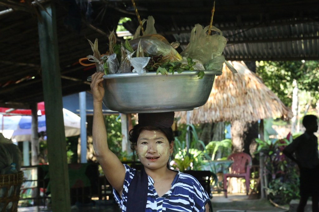 ဆိုင်မှာထိုင်၊ ကော်ဖီမစ် မှာပြီး ပါလာတဲ့ ကောက်ညှင်းပေါင်းကို စားဖို့ ပြင်နေတုန်း ဒန်ဇလုံ ကြီး ခေါင်းပေါ်ရွက်ထားတဲ့ဈေးသည် အမျိုးသမီးတစ်ယောက်တက်လာတယ်။ သူ့ဇလုံကြီးထဲမှာ အမျိုး အစားမသိတဲ့ ပင်လယ် ငါးခြောက်တွေပါလာတယ်။ လက်သုံးလုံးလောက် အပြားလေးသုံးခုကို တစ်ထောင့်နှစ်ရာ နဲ့ ဝယ်၊ ဆိုင်ကို ကြော်ခိုင်းပြီး ကောက်ညှင်းပေါင်းနဲ့ စားတယ်။ ဈေးသည် အမကြီး က ရေ မြောင်ကြီးကပဲ။ မနက် သုံးနာရီထပြီး ဆိုင်ကယ်နဲ့ ကျိုက်ထို သွား ဈေးဝယ်၊ ပြန်လာပြီး ရေမြောင် ကြီးနဲ့ ဘိုးပြန်တောင်ကြားမှာရှိတဲ့ တဲစုတွေမှာ ဈေးလိုက်ရောင်းတယ်။