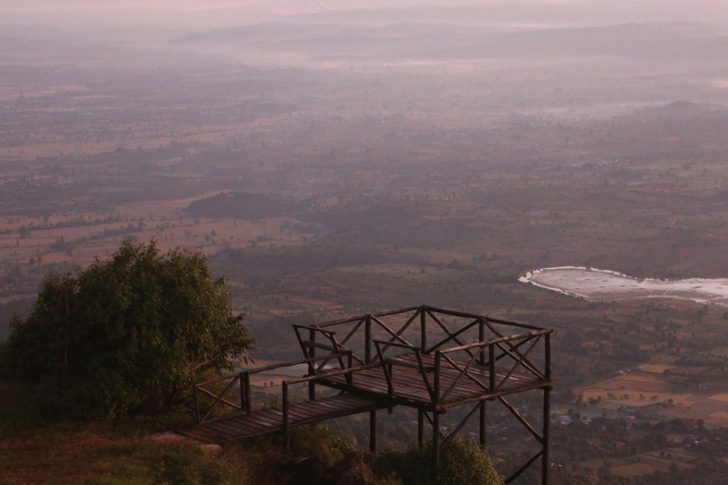 ကျွန်တော်တို့က ဘယ်ဘက်ကို ချိုးပြီး ပထမ ရှုခင်းသာ ကို အရင်သွားလိုက်တယ်။ ကျွန်တော်တို့ ရောက်သွားတော့ အဲဒီနေရာက ပျက်နေပြီ။ ဆိုင်အဆောက်အဦလို့ထင်ရတဲ့ အဆောက်အဦက မီးလောင်ပြာကျနေတယ်။ နားနေတဲ့ ငါးလုံးကလည်း ဖရိုဖရဲ ပြိုလဲလို့။ တောင် ပေါ် တောတွင်းလမ်းလေ ျှာက်ခရီးစဉ်တွေရပ်နားသွားတဲ့ အကျိုးဆက်ပဲထင်ပါရဲ့။ တဲတစ်လုံးမှာ ခဏနားပြီးပါလာတဲ့ ခေါပုတ်ကြော်၊ ကောက်ညှင်းကျည်တောက်စားတယ်။ ပြီးတော့ View Point ဘက်ကို ပြန်သွားတယ်။