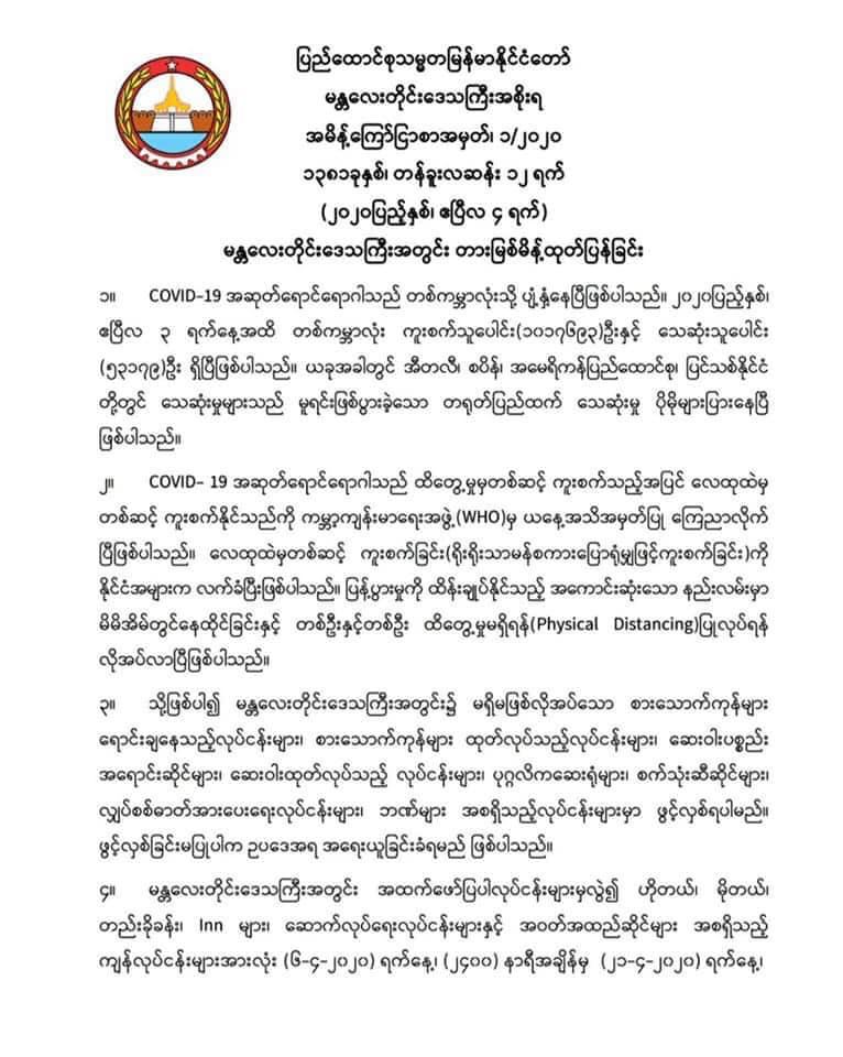 မန္တလေးတိုင်းဒေသကြီးအစိုးရက ဒီနေ့ ( ဧပြီ ၄ ) ရက်စွဲနဲ့ မန္တလေးတိုင်းဒေသကြီးအတွင်း တားမြစ်မိန့်ထုတ်ပြန်ခဲ့ပါတယ်။ ပုံ ၁